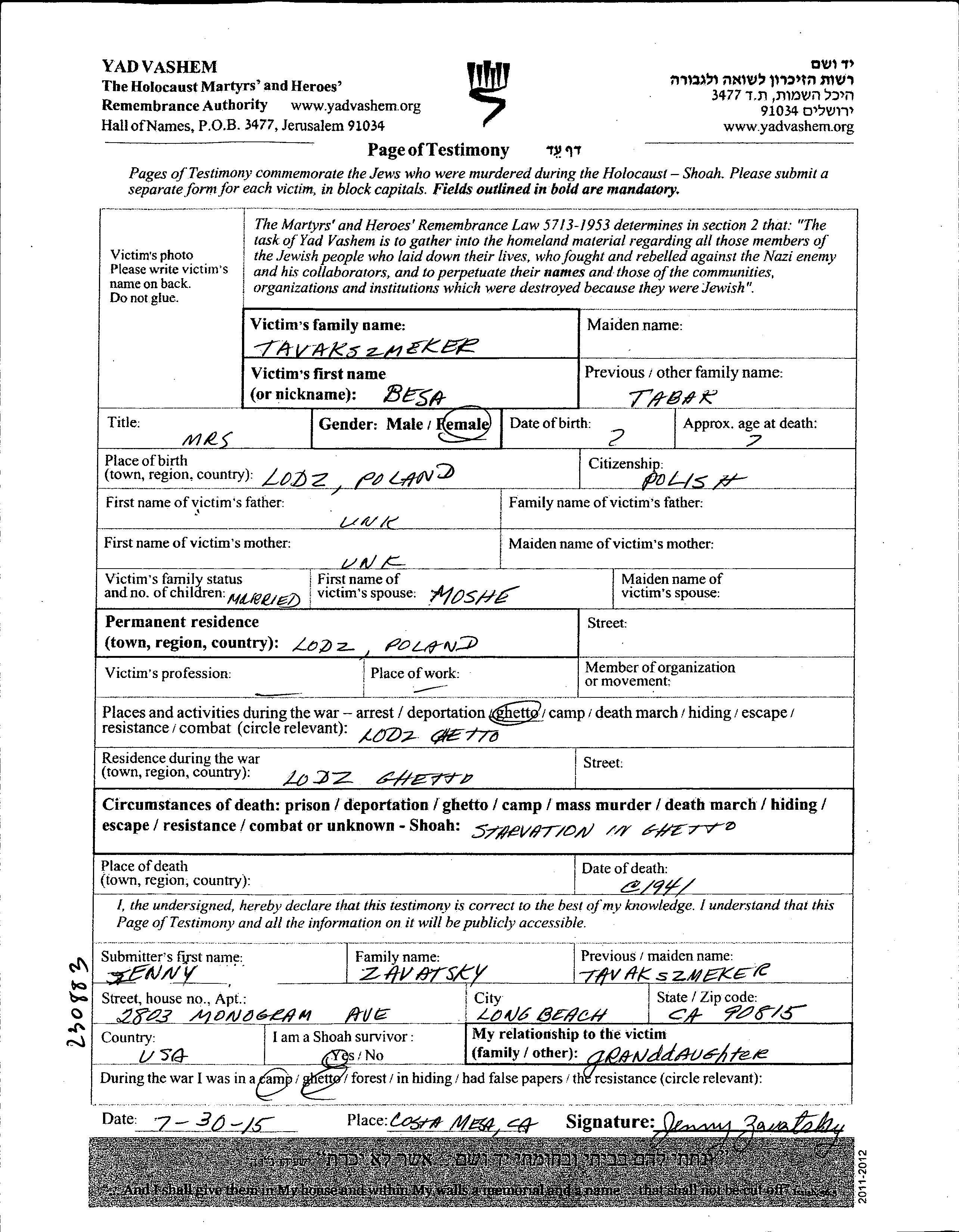 Besa Tavakszmeker Tabak wurde in Lodz, Polen geboren. Sie war mit Moshe Verheiratet. Vor dem Zweiten Weltkrieg lebte sie in Lodz, Polen. Während des Krieges war sie in Lodz, Polen.
