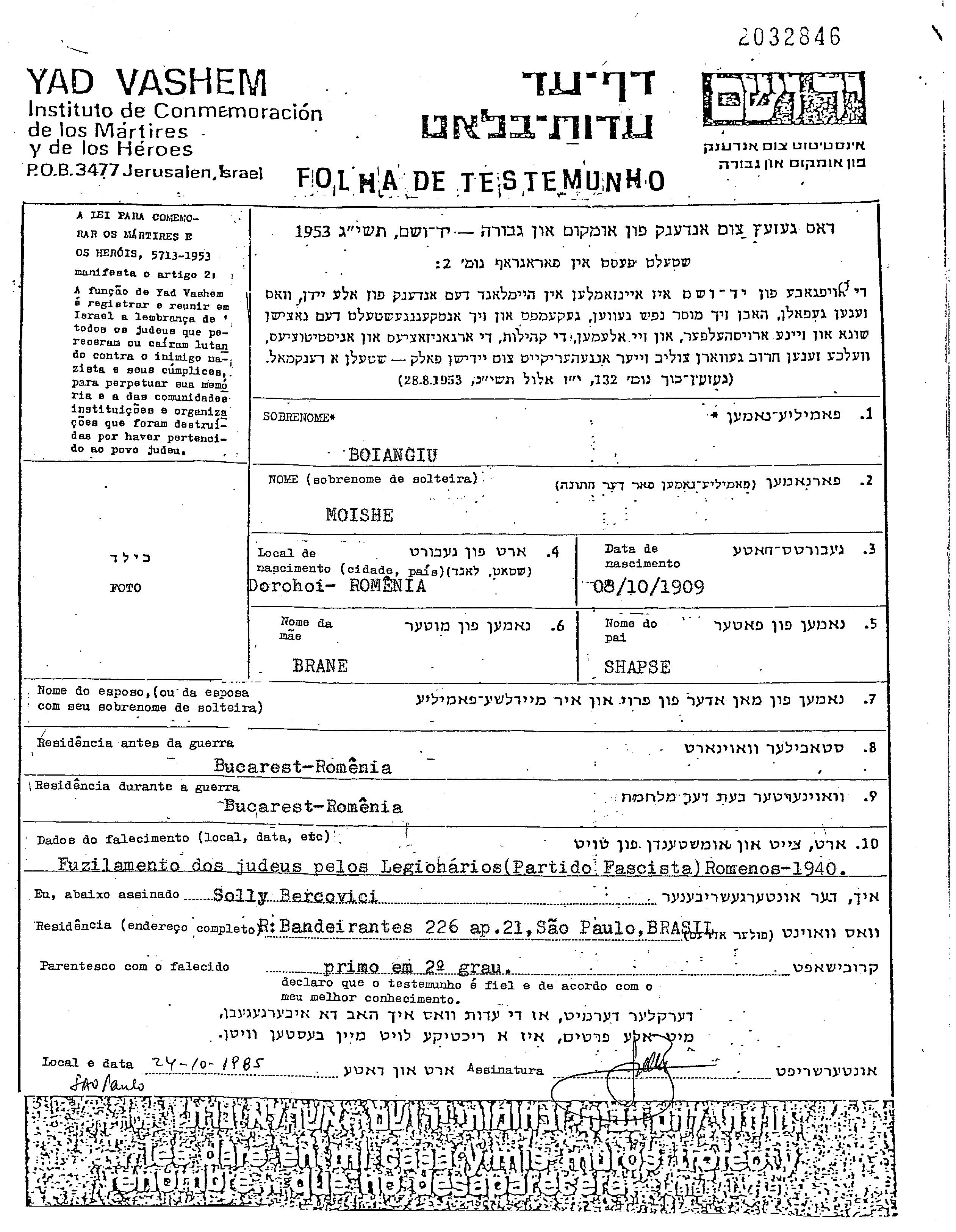 Moishe wurde in der Schoah ermordet. Todesort: Bucuresti, Rumänien im Jahr 21/01/1940.