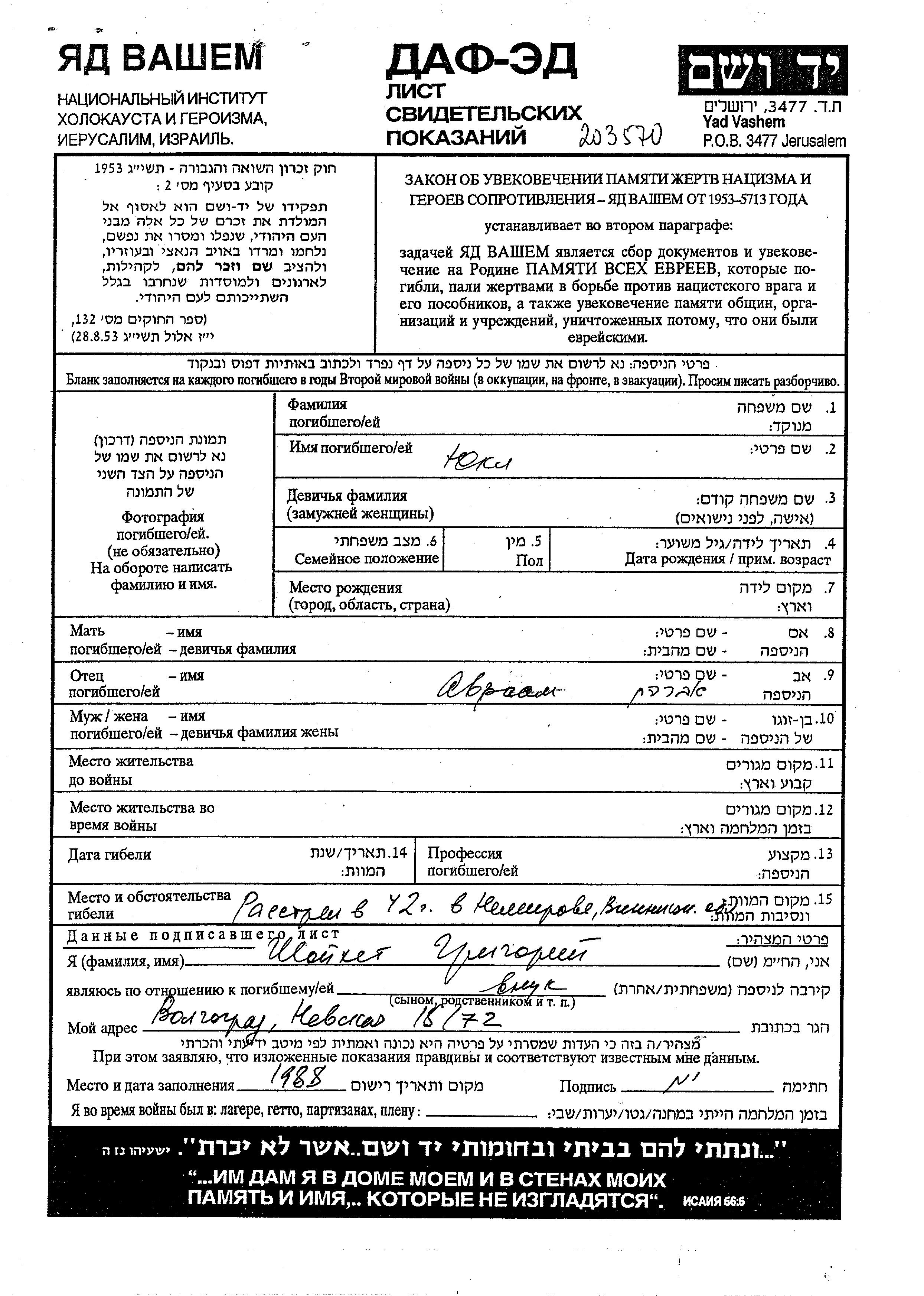 Yukl wurde in der Schoah ermordet. Todesort: Nemirov, Ukraine (UdSSR) im Jahr 1942.