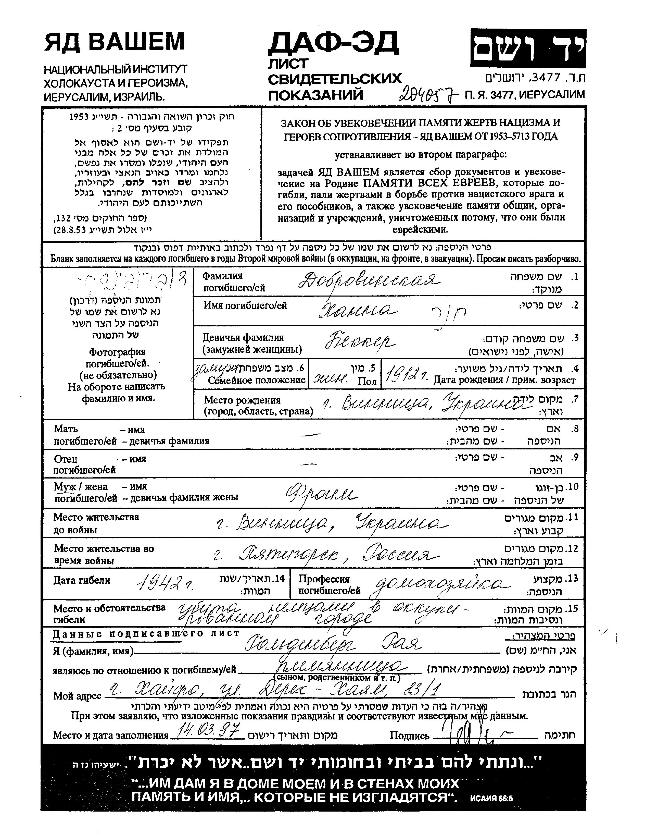 Khana Dobrovinski, geb. Beker wurde im Jahr 1912 in Vinnitsa, Ukraine (UdSSR) geboren. Sie war Hausfrau und mit Froim Verheiratet. Vor dem Zweiten Weltkrieg lebte sie in Vinnitsa, Ukraine (UdSSR). Während des Krieges war sie in Pyatigorsk, Russland (UdSSR).