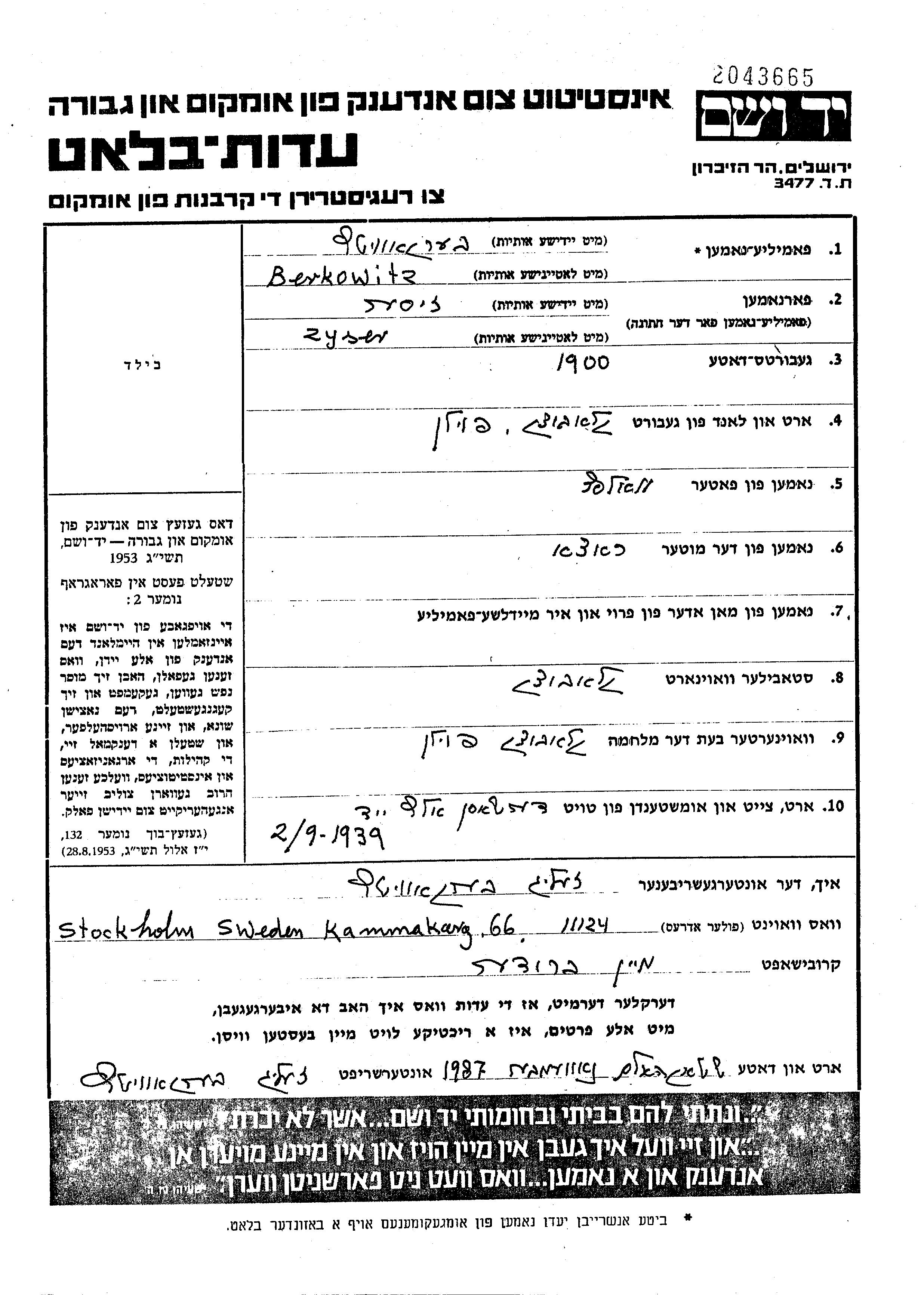 Zyser Berkowitz wurde im Jahr 1900 in Klobuck, Polen geboren. Er war der Sohn von Wolf und Raca, geb. Zelkowicz. Vor dem Zweiten Weltkrieg lebte er in Klobuck, Polen. Während des Krieges war er in Klobuck, Polen.