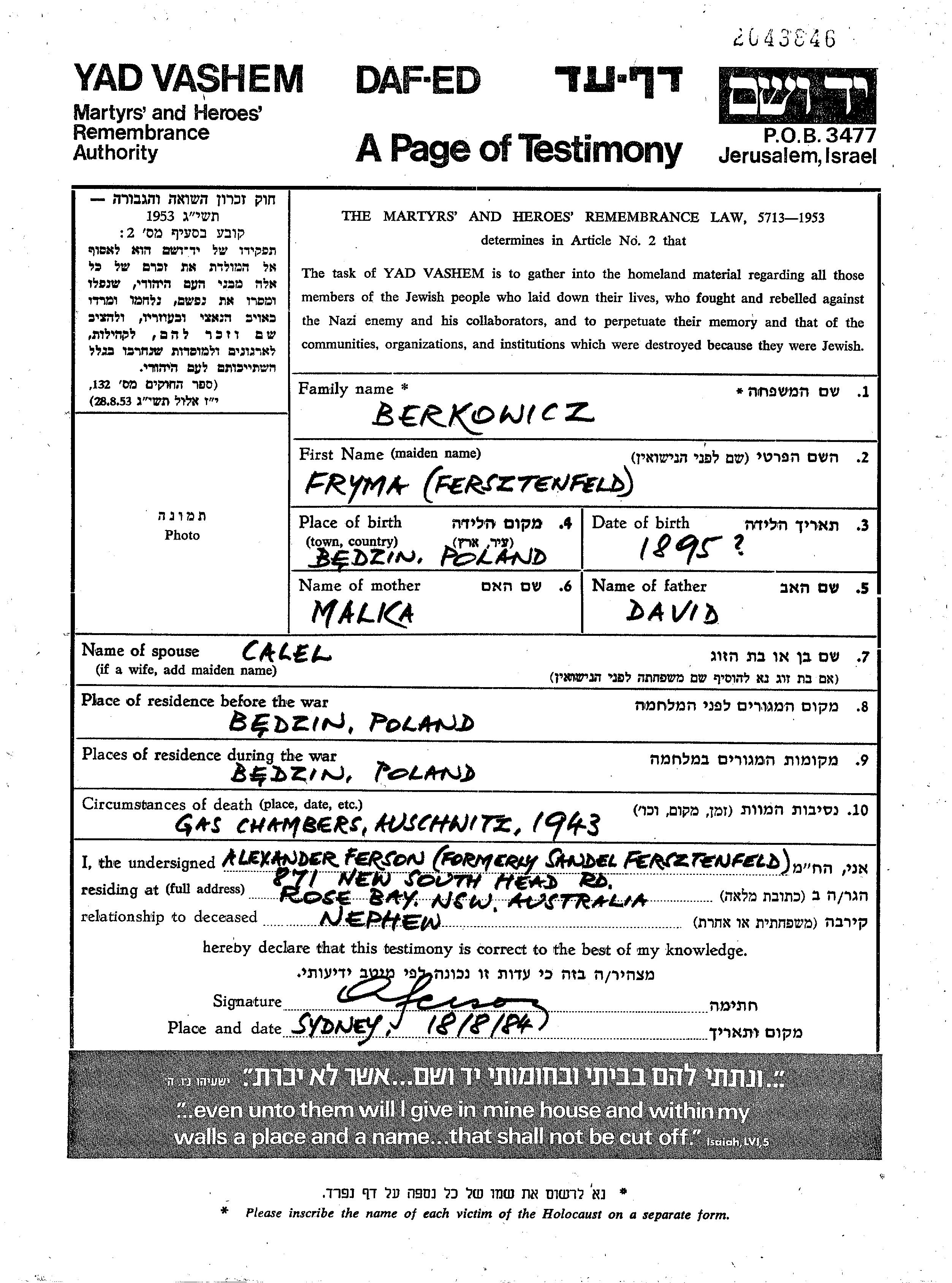 Fryma Berkowicz, geb. Fersztenfeld wurde im Jahr 1895 in Będzin, Polen geboren. Sie war die Tochter von David und Malka. Sie war mit Calel Verheiratet. Vor dem Zweiten Weltkrieg lebte sie in Będzin, Polen. Während des Krieges war sie in Będzin, Polen.