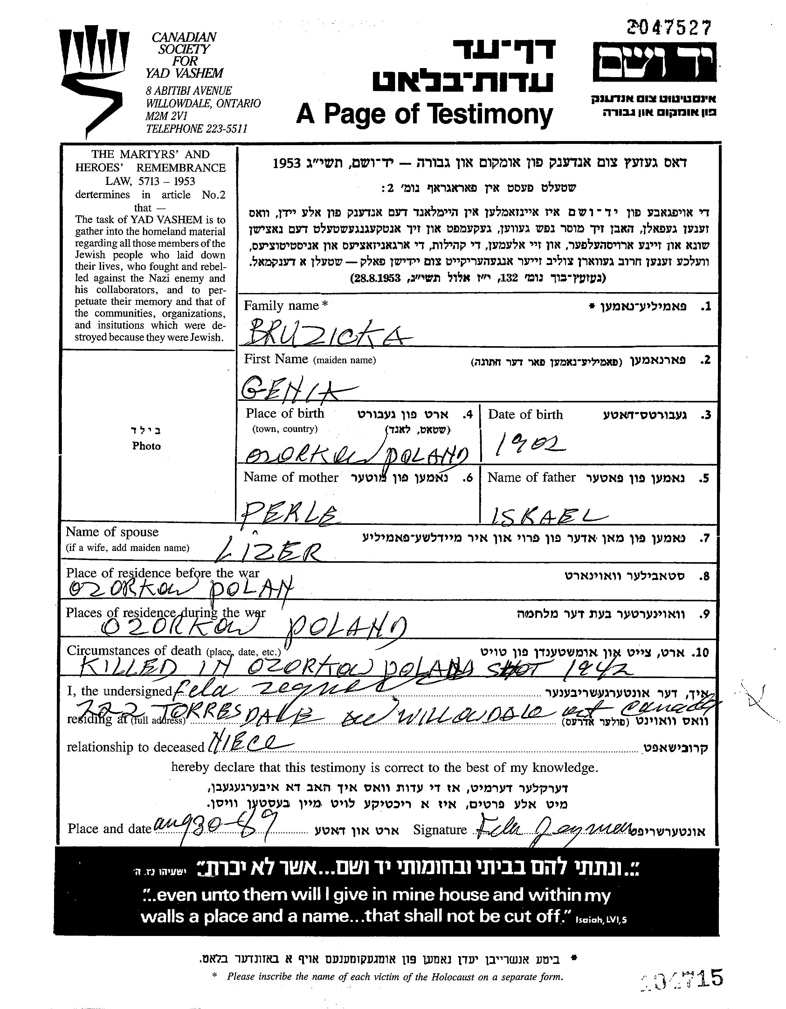 Genia Bruzicki wurde in Ozorkow, Polen geboren. Sie war die Tochter von Israel und Perla. Sie war mit Eliezer Verheiratet. Vor dem Zweiten Weltkrieg lebte sie in Ozorkow, Polen. Während des Krieges war sie in Ozorkow, Polen.