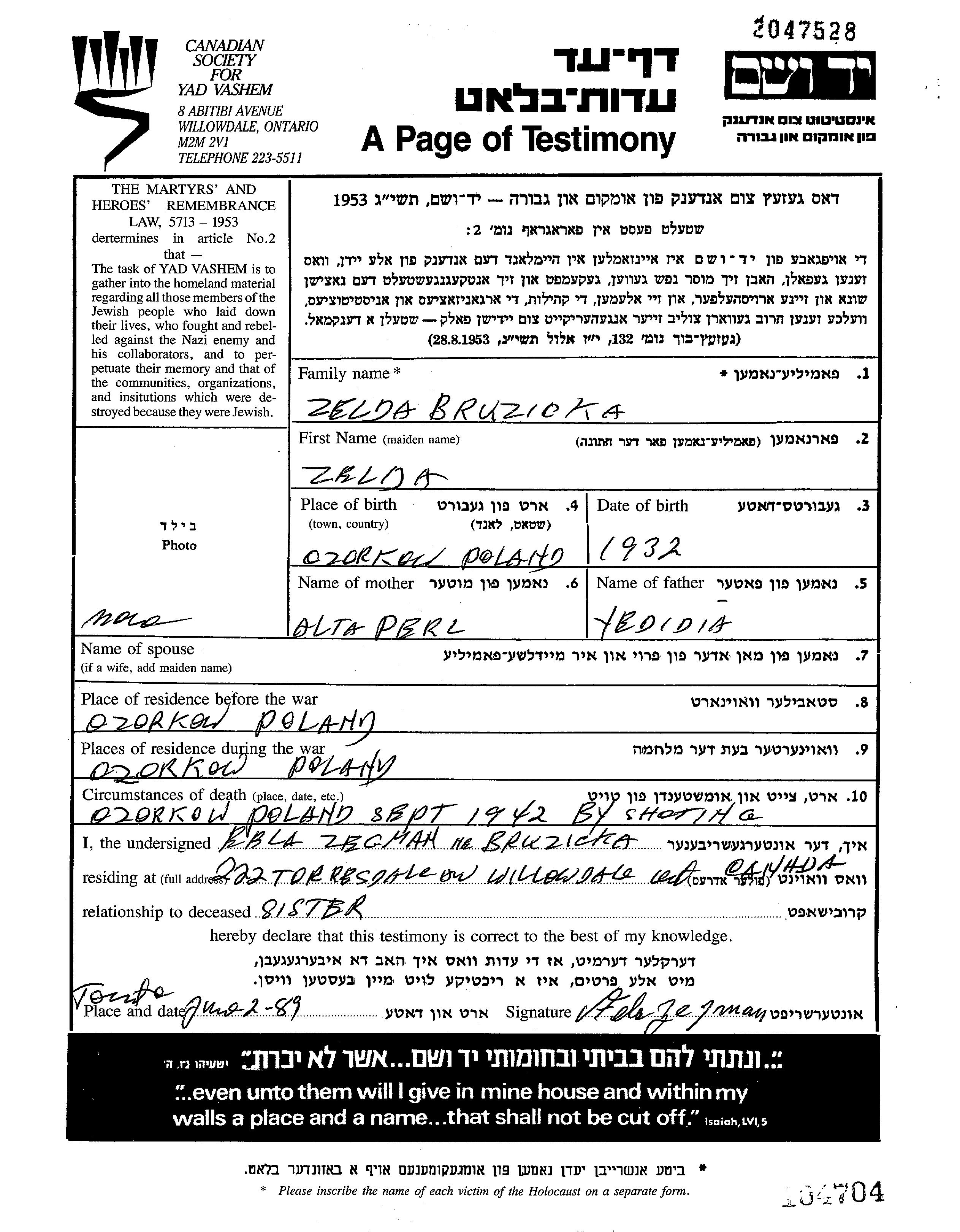 Zelda Bruzicki wurde in Ozorkow, Polen geboren. Sie war die Tochter von Yedidia und Alta Perl, geb. Waldman. Sie war Kind. Vor dem Zweiten Weltkrieg lebte sie in Ozorkow, Polen. Während des Krieges war sie in Ozorkow, Polen.
