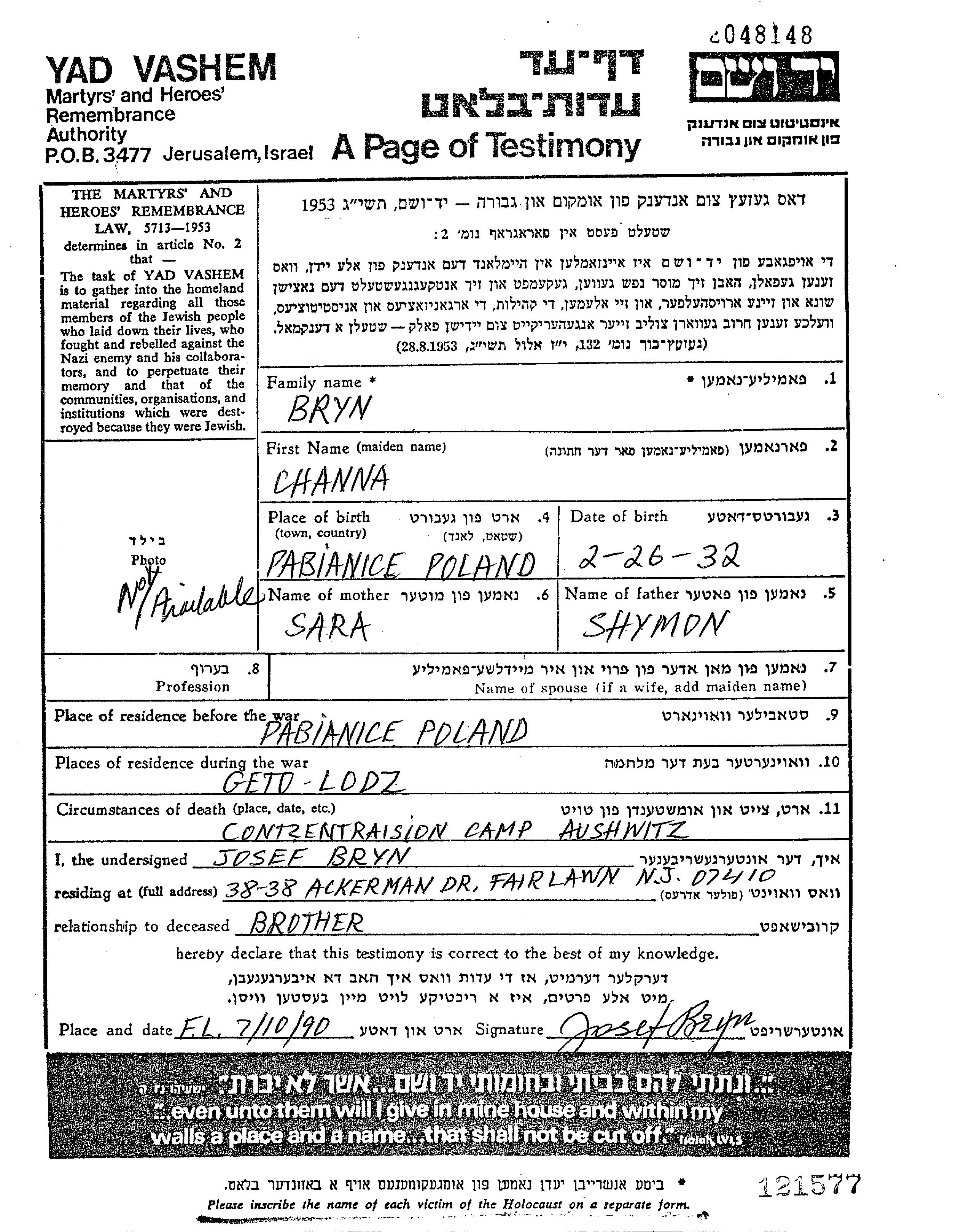 Channa Bryn wurde im Jahr 1932 in Pabianice, Polen geboren. Sie war die Tochter von Shymon und Sara. Sie war Kind. Vor dem Zweiten Weltkrieg lebte sie in Pabianice, Polen. Während des Krieges war sie in Lodz, Polen.