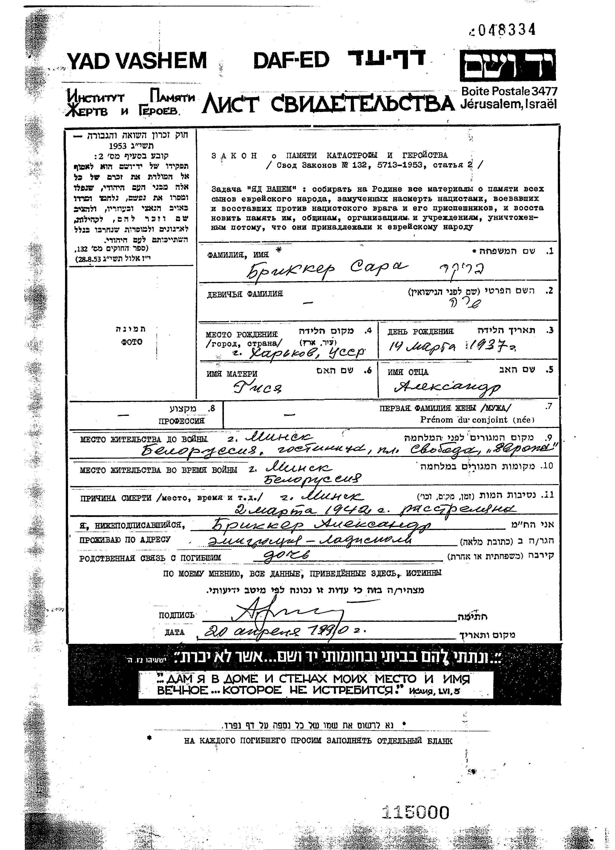 Briker Sara 1937 Minsk, Weißrussland (UdSSR) Gedenkblatt