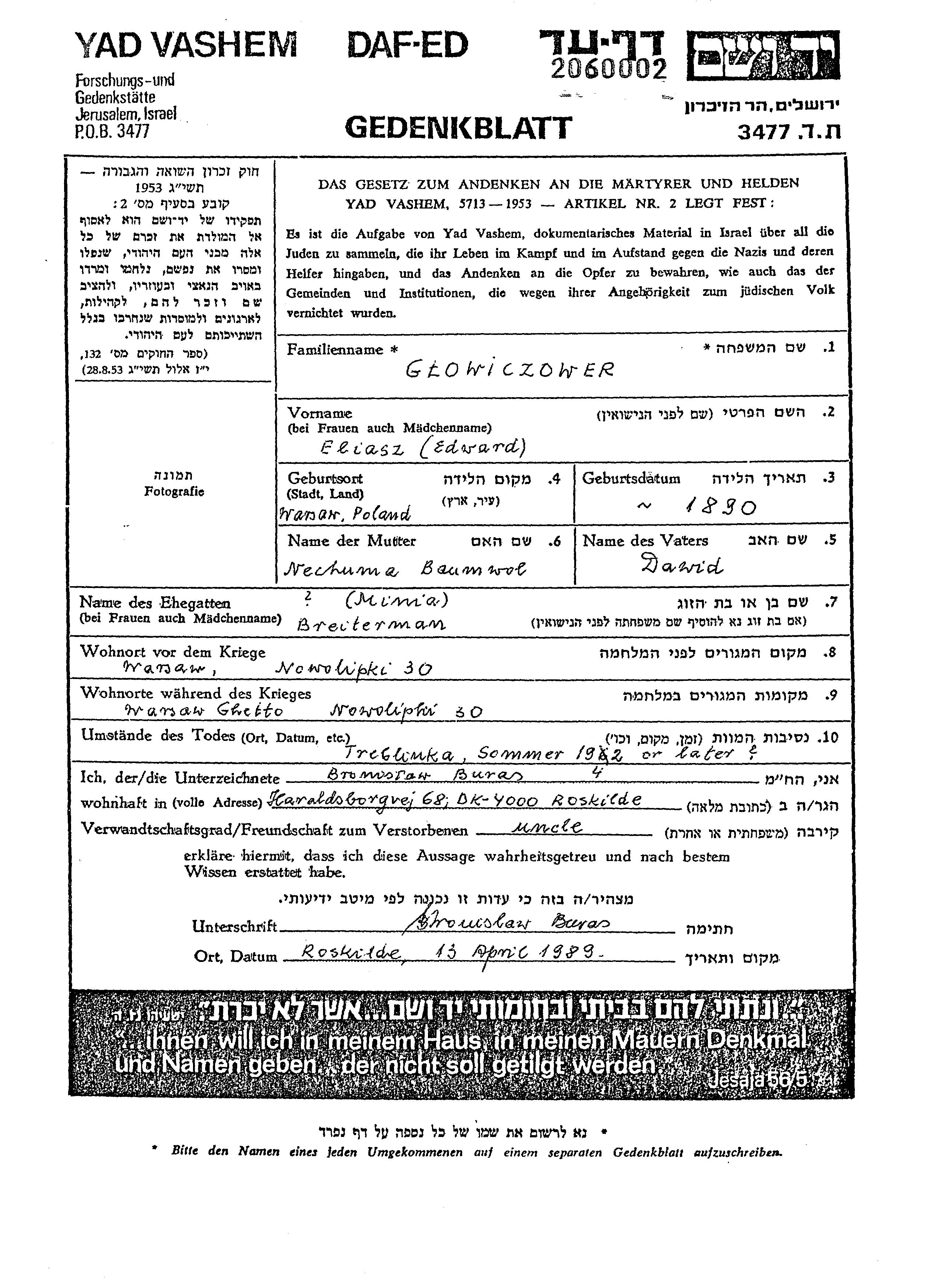 Eliasz Edward wurde in der Schoah ermordet. Todesort: Treblinka, Polen im Jahr 1942.