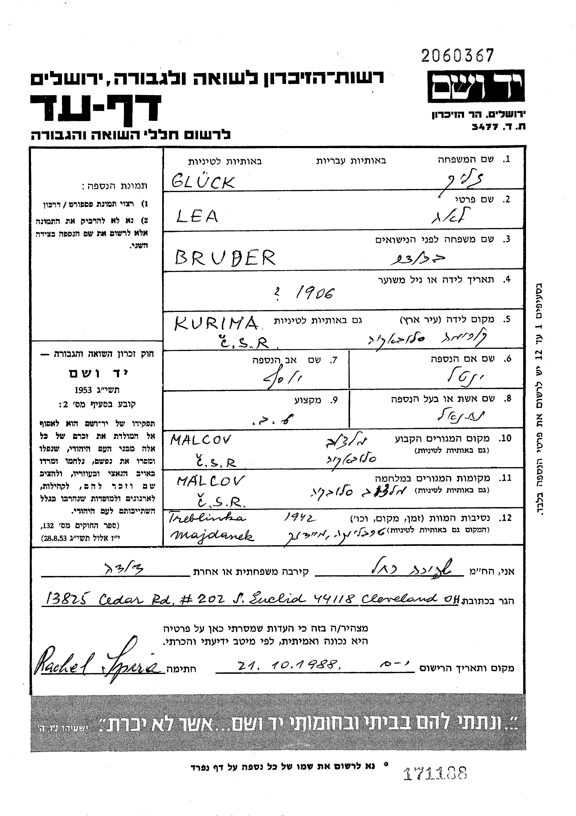 Lea Glück, geb. Broder wurde im Jahr 1906 in Kurima, Tschechoslowakei geboren. Sie war die Tochter von Yosef und Yentel. Sie war Hausfrau und mit Natanel Verheiratet. Vor dem Zweiten Weltkrieg lebte sie in Malcov, Tschechoslowakei. Während des Krieges war sie in Malcov, Tschechoslowakei.