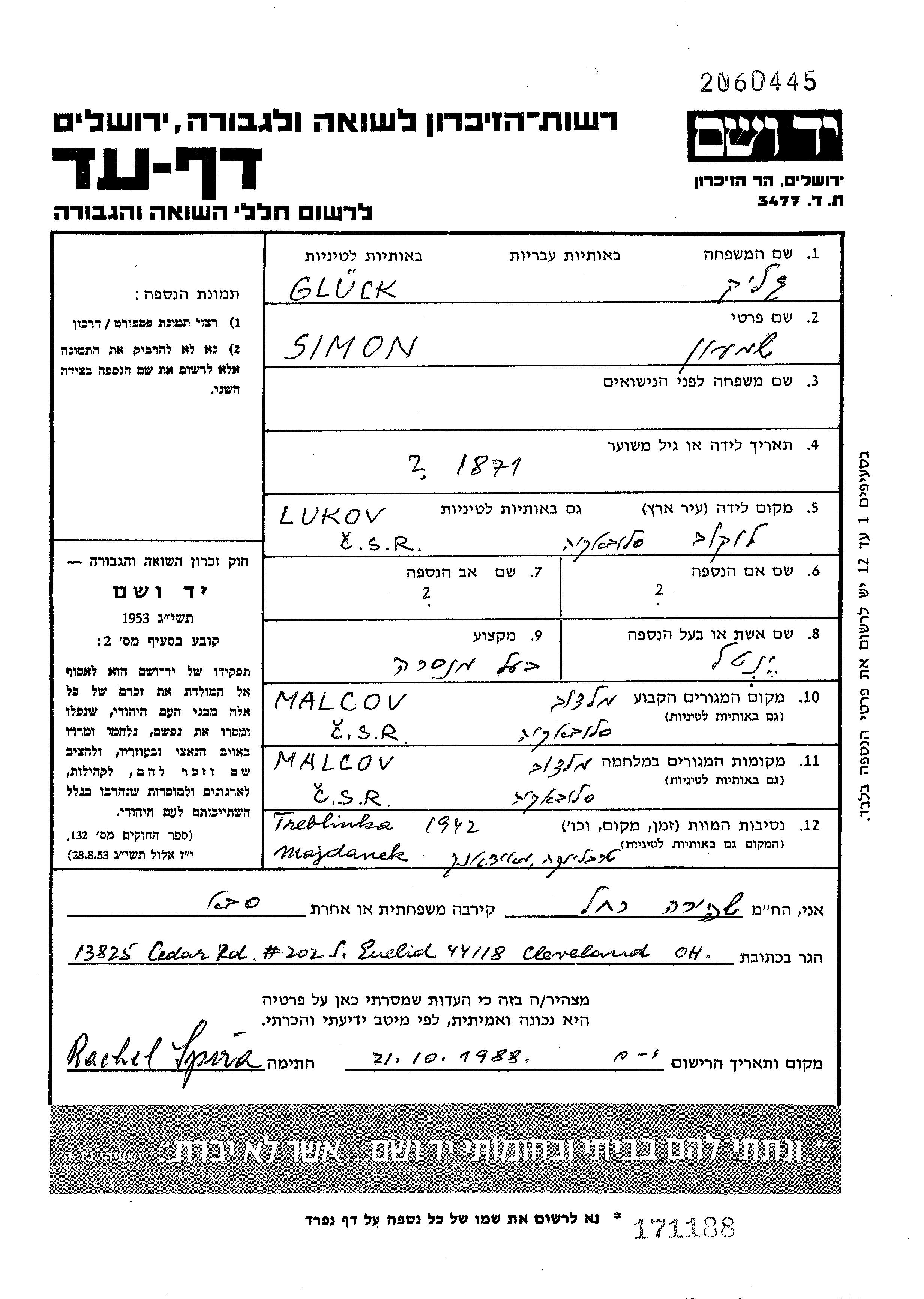 Simon Glück wurde im Jahr 1871 in Lukovo, Tschechoslowakei geboren. Er war Sägewerksbesitzer und mit Yentel Verheiratet. Vor dem Zweiten Weltkrieg lebte er in Malcov, Tschechoslowakei. Während des Krieges war er in Malcov, Tschechoslowakei.