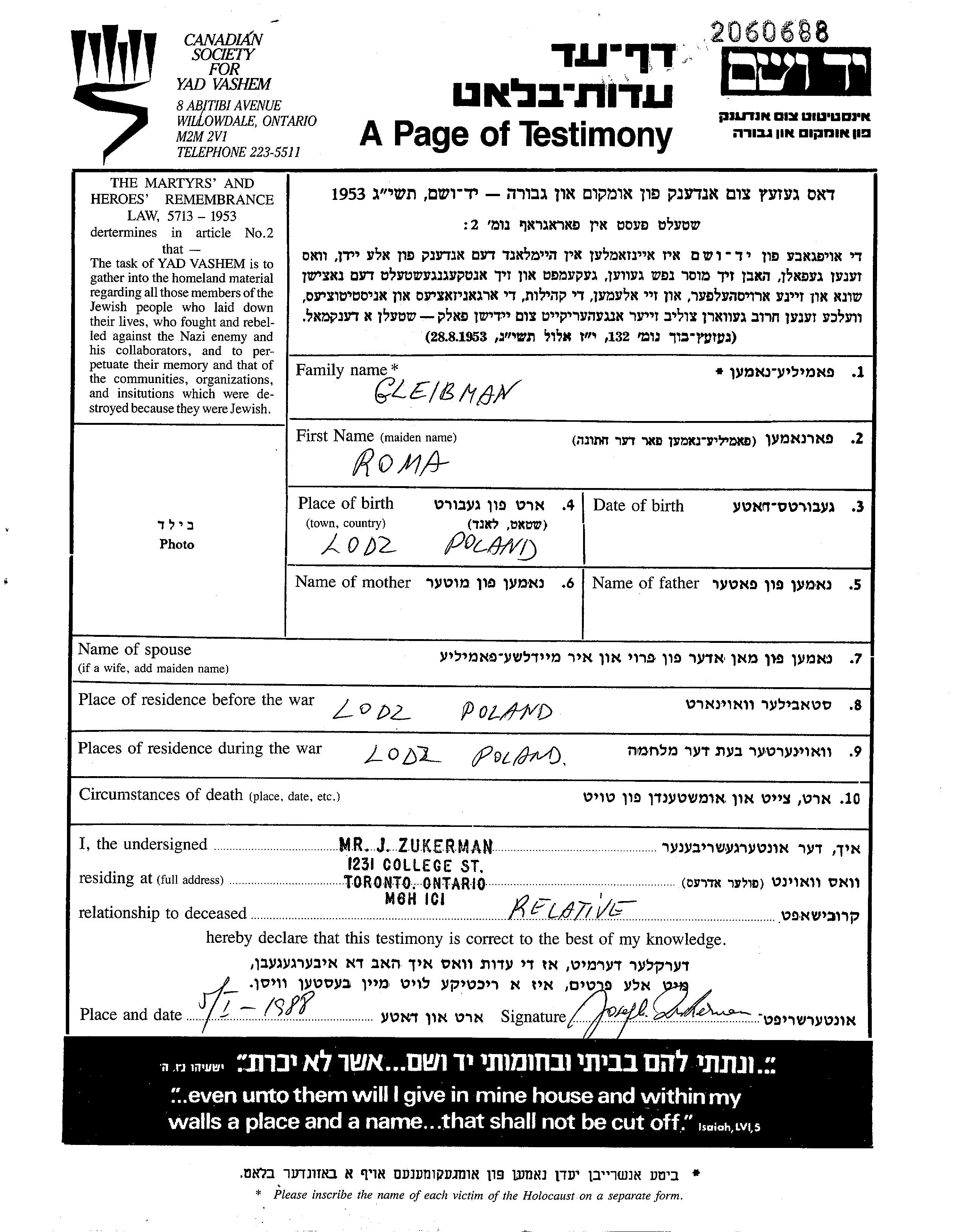 Roma Gleibman wurde in Lodz, Polen geboren. Vor dem Zweiten Weltkrieg lebte er in Lodz, Polen. Während des Krieges war er in Lodz, Polen.