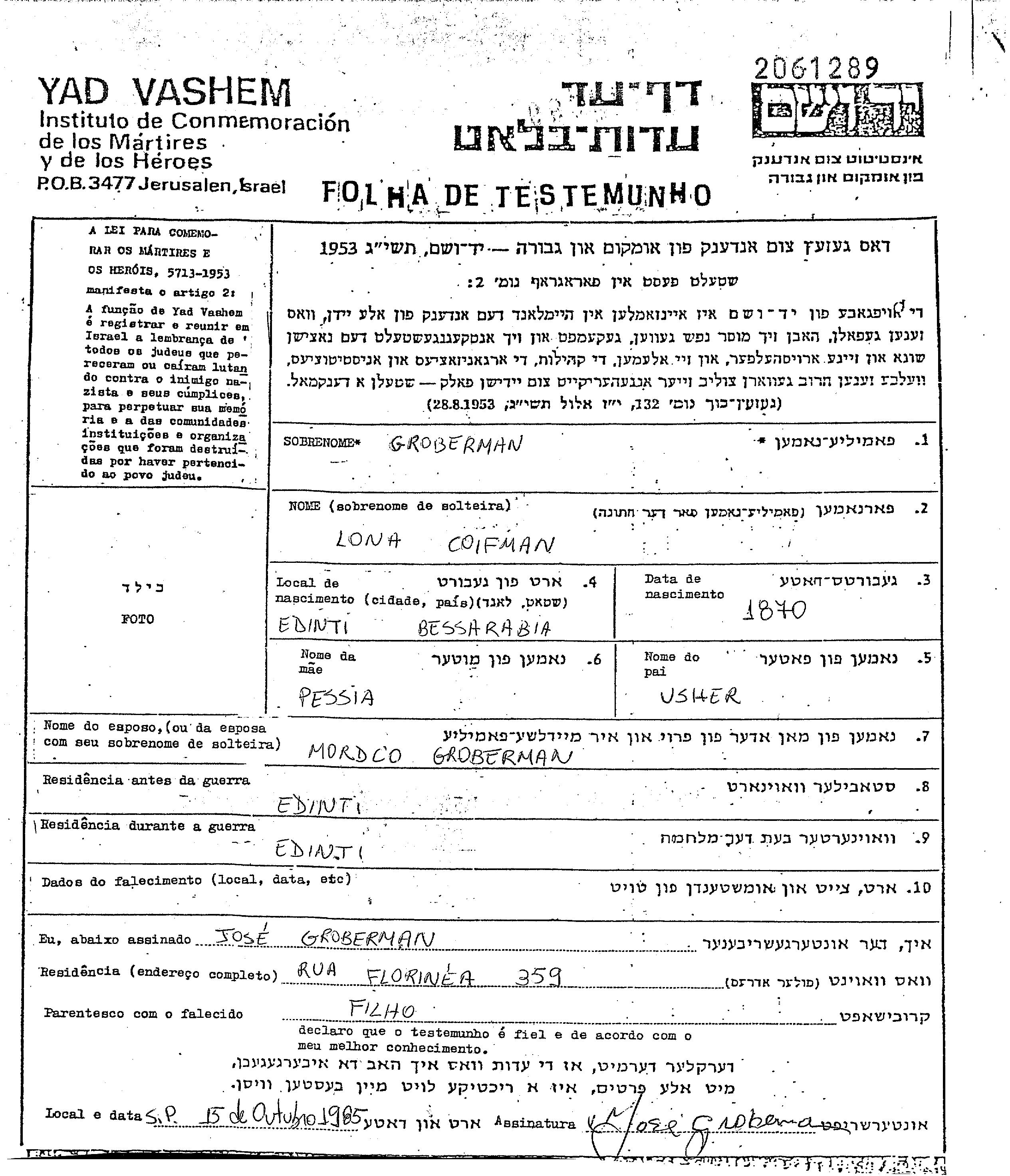 Lona Groberman, geb. Koifman wurde im Jahr 1870 in Edineti, Rumänien geboren. Sie war die Tochter von Usher und Pessia. Sie war mit Mordco Verheiratet. Vor dem Zweiten Weltkrieg lebte sie in Edineti, Rumänien. Während des Krieges war sie in Edineti, Rumänien.