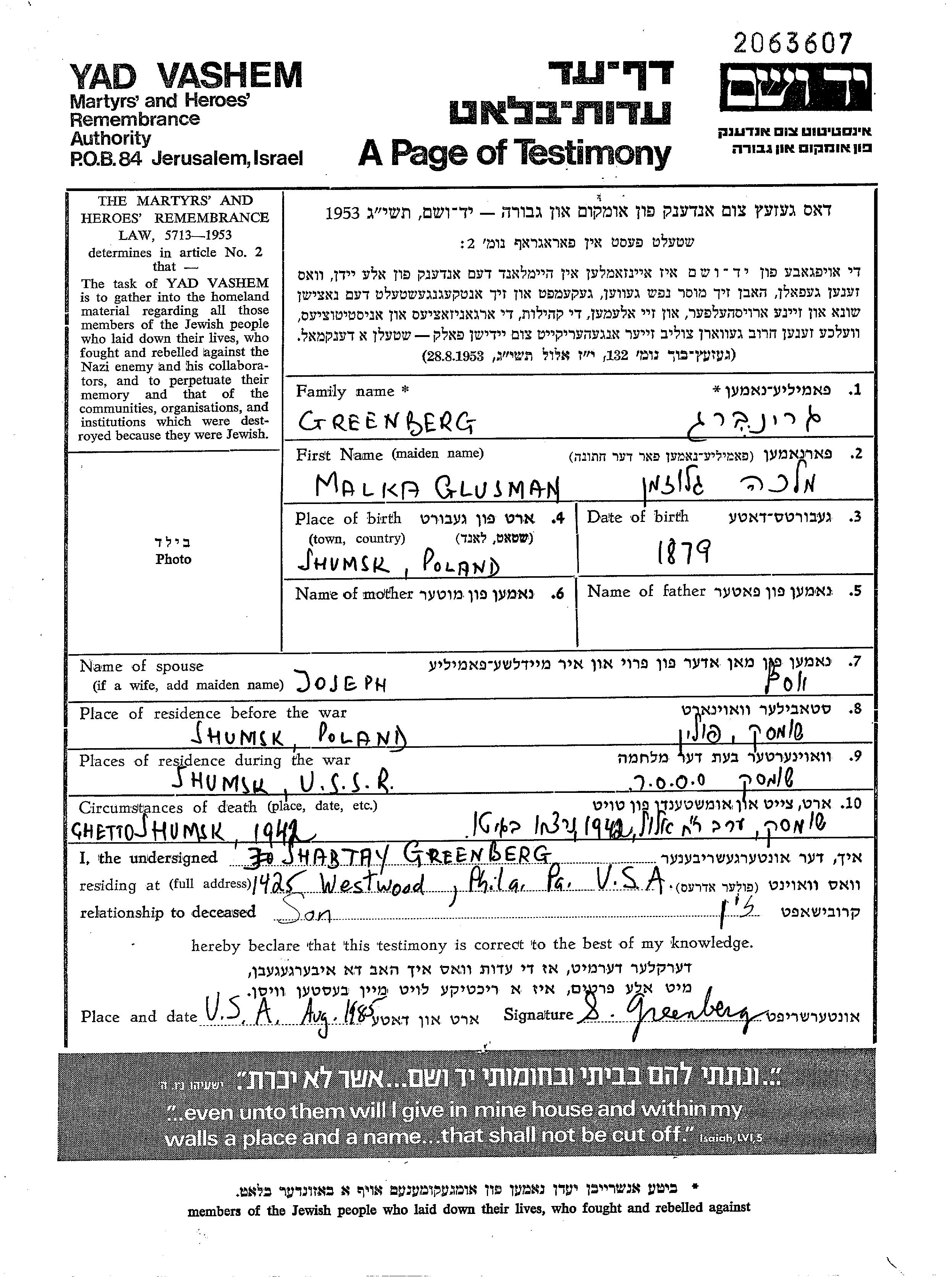 Malka Greenberg, geb. Glusman wurde im Jahr 1879 in Szumsk, Polen geboren. Sie war mit Joseph Verheiratet. Vor dem Zweiten Weltkrieg lebte sie in Szumsk, Polen. Während des Krieges war sie in Szumsk, Polen.