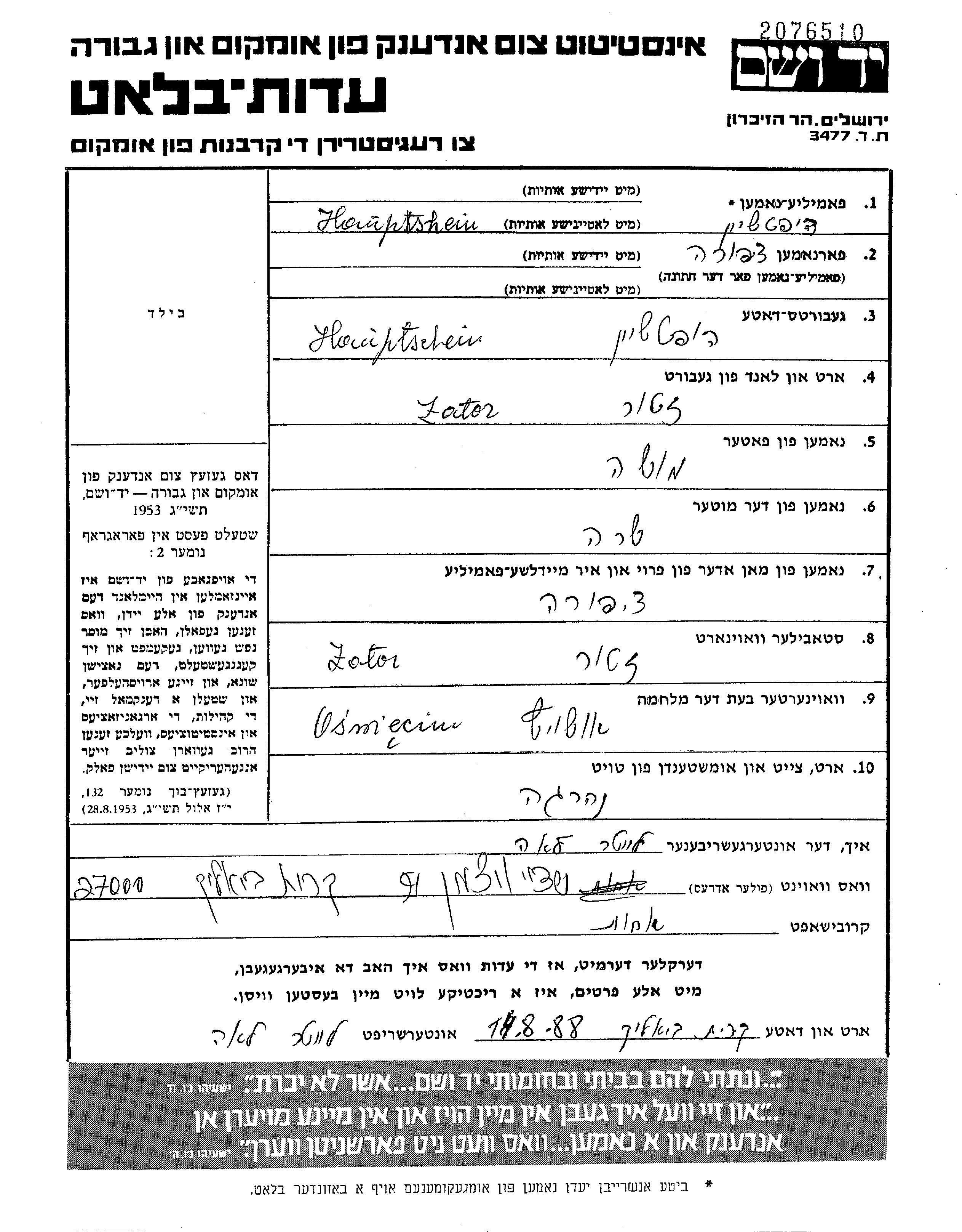 Hauptschein Hoiptshein Tzipora Zator, Polen Gedenkblatt