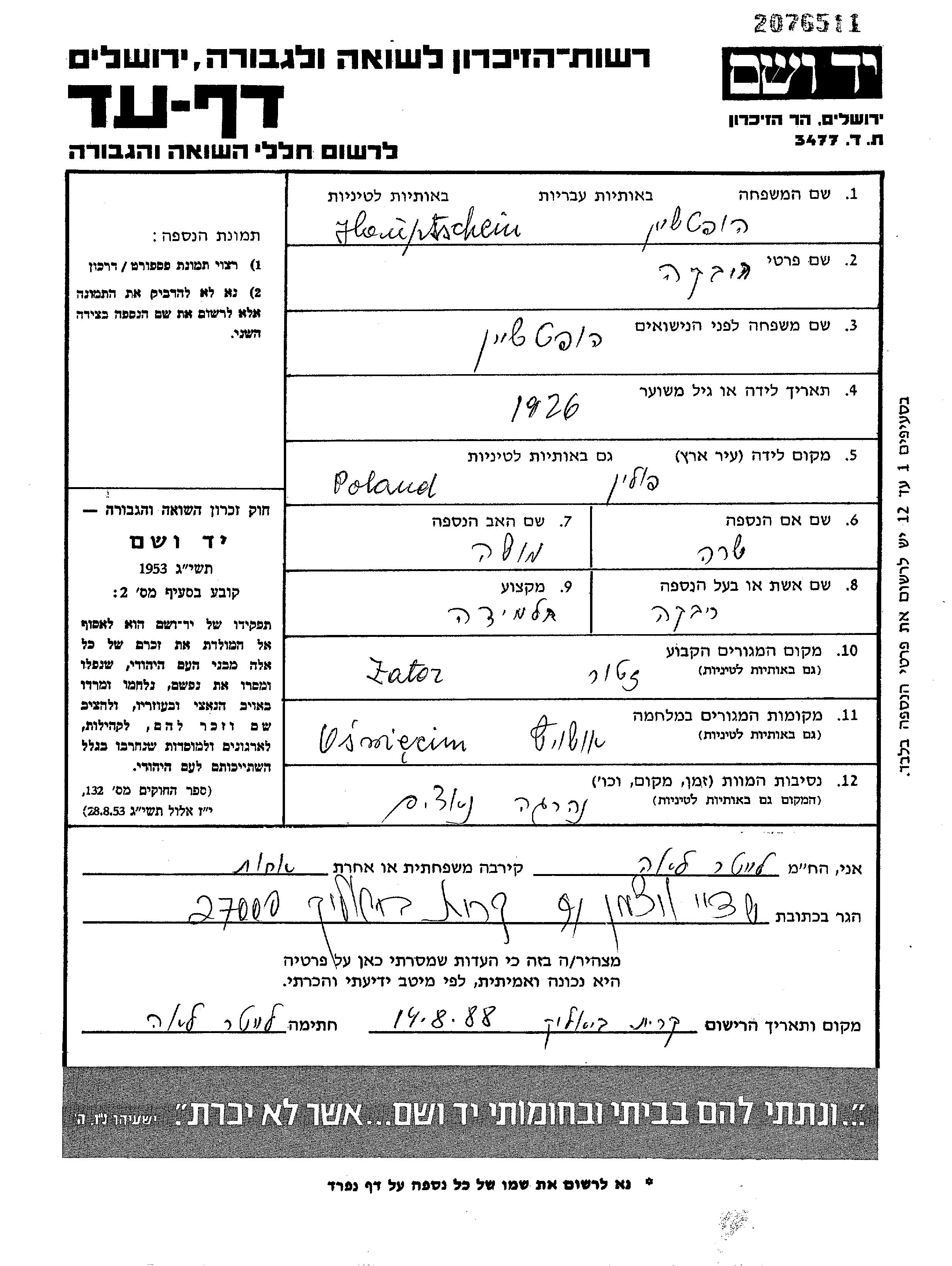 Rivka Hauptschein Hoiptshein wurde im Jahr 1926 in Polen geboren. Sie war die Tochter von Moshe und Sara, geb. Grubner. Sie war Schüler/-in und Kind. Vor dem Zweiten Weltkrieg lebte sie in Zator, Polen.