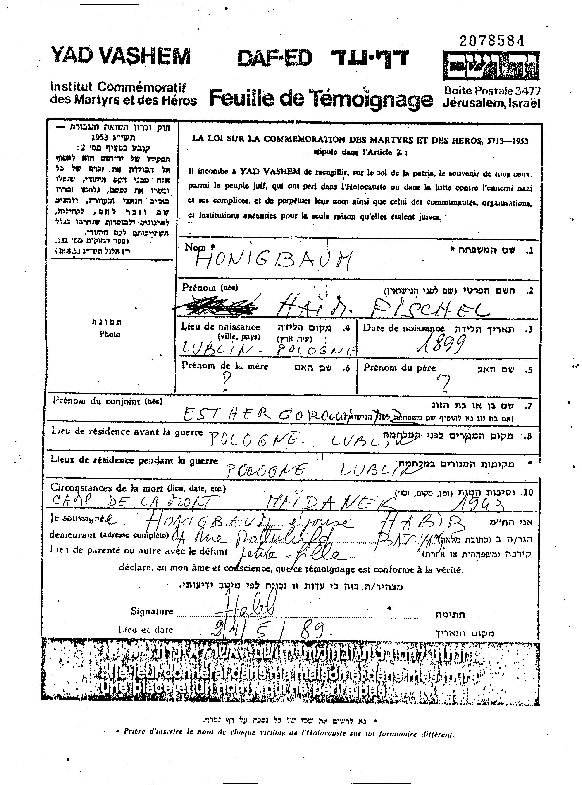 Haim Fischel Honigbaum wurde im Jahr 1899 in Lublin, Polen geboren. Er war mit Esther Verheiratet. Vor dem Zweiten Weltkrieg lebte er in Lublin, Polen. Während des Krieges war er in Lublin, Polen.