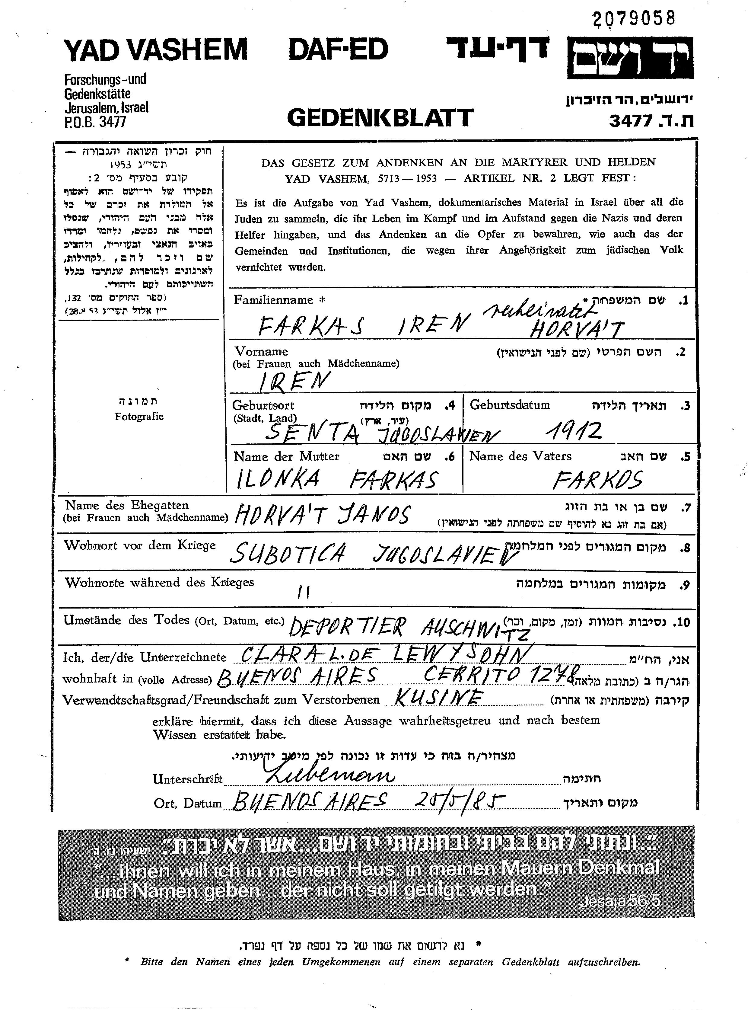 Iren Horvat, geb. Farkas wurde im Jahr 1912 in Senta, Jugoslawien geboren. Sie war die Tochter von Ilonka. Sie war mit Janos Verheiratet. Vor dem Zweiten Weltkrieg lebte sie in Subotica, Jugoslawien. Während des Krieges war sie in Subotica, Jugoslawien.