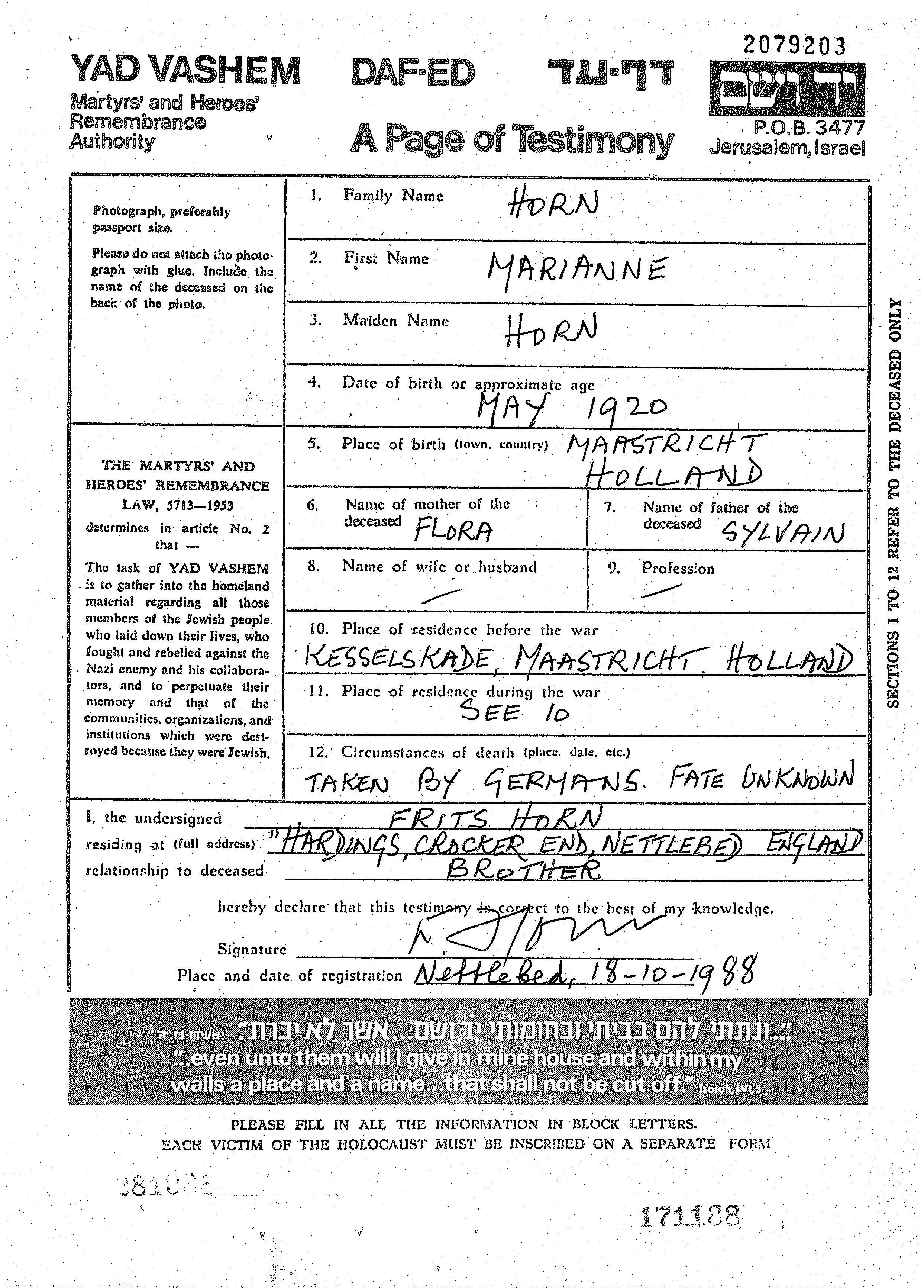 Marianne Horn wurde im Jahr 1920 in Maastricht, Niederlande geboren. Sie war die Tochter von Sylvain und Flora, geb. Wyngaard. Sie war Ledig. Vor dem Zweiten Weltkrieg lebte sie in Maastricht, Niederlande. Während des Krieges war sie in Maastricht, Niederlande.