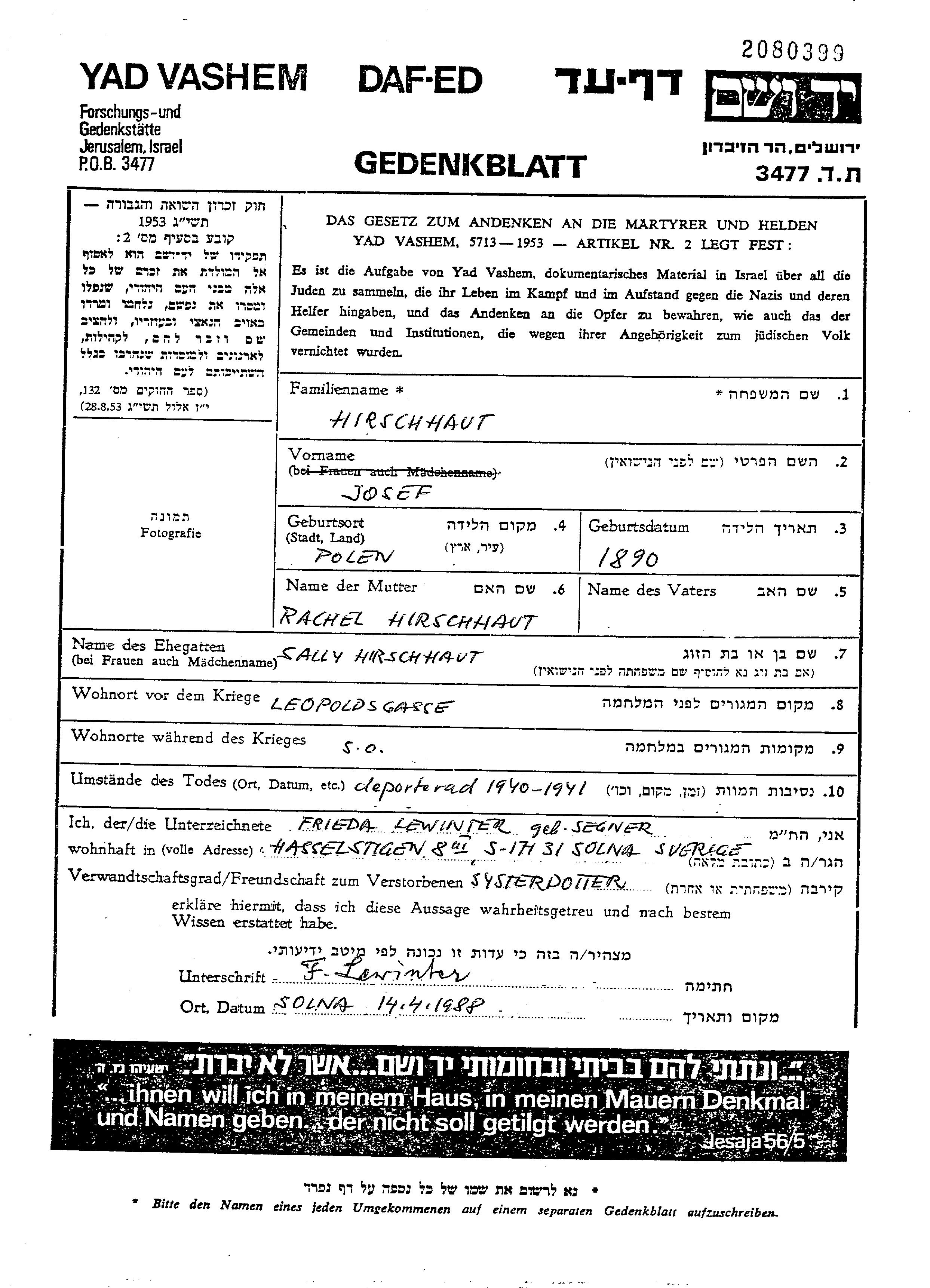 Josef Hirschhaut wurde im Jahr 1890 in Polen geboren. Er war der Sohn von Rachel. Er war mit Sally Verheiratet. Vor dem Zweiten Weltkrieg lebte er in Wien, Österreich. Während des Krieges war er in Wien, Österreich.