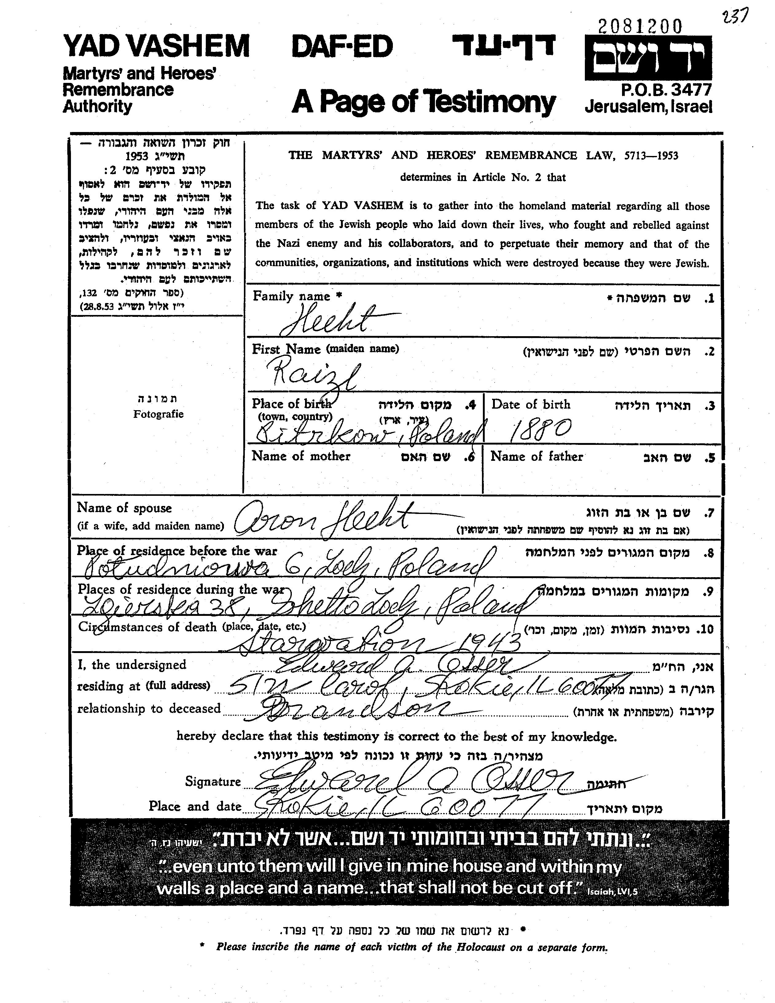 Raizl Hecht wurde im Jahr 1880 in Piotrkow Trybunalski, Polen geboren. Sie war mit Aron Verheiratet. Vor dem Zweiten Weltkrieg lebte sie in Lodz, Polen. Während des Krieges war sie in Lodz, Polen.