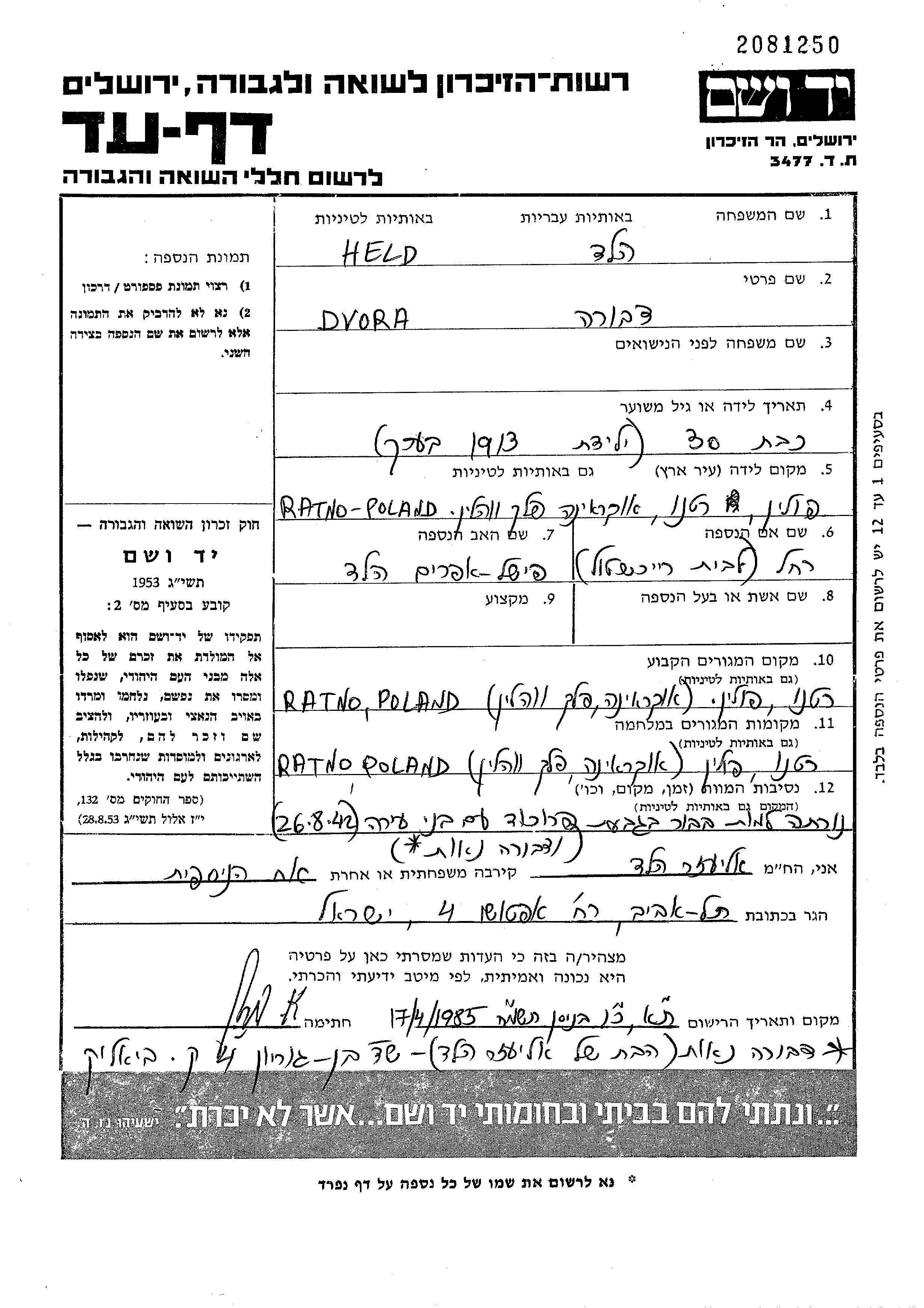 Dvora Held wurde im Jahr 1912 in Ratno, Polen geboren. Sie war die Tochter von Fischel Efraim und Rachel, geb. Reikhshtul. Vor dem Zweiten Weltkrieg lebte sie in Ratno, Polen. Während des Krieges war sie in Ratno, Polen.