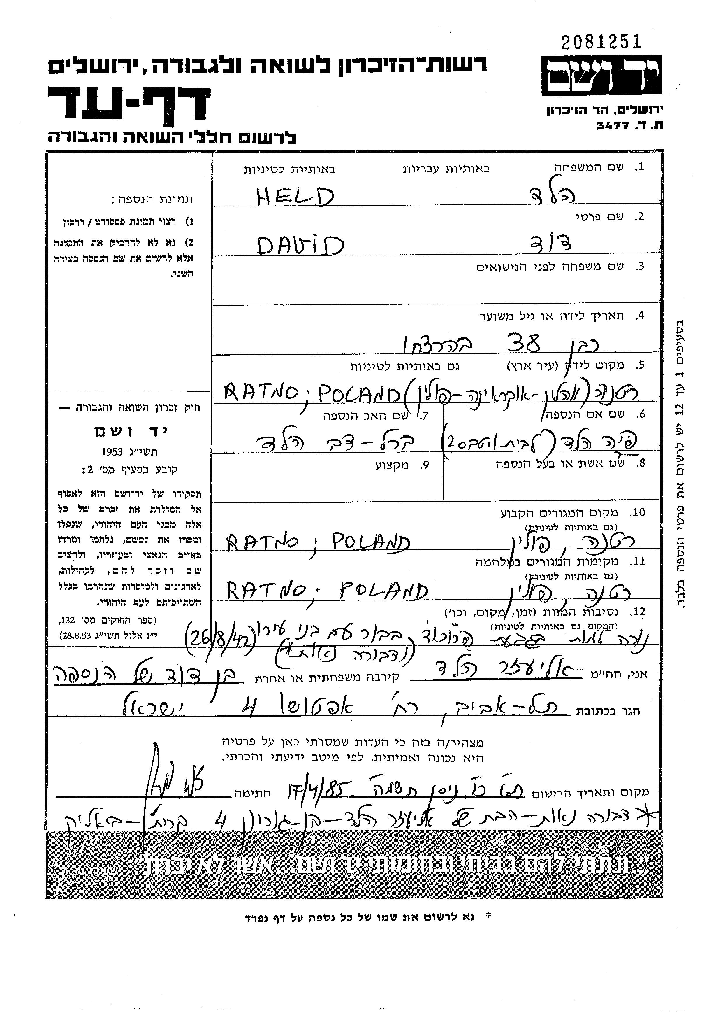 David Held wurde im Jahr 1904 in Ratno, Polen geboren. Er war der Sohn von Berl Dov und Paya Faia, geb. Vitbes. Vor dem Zweiten Weltkrieg lebte er in Ratno, Polen. Während des Krieges war er in Ratno, Polen.