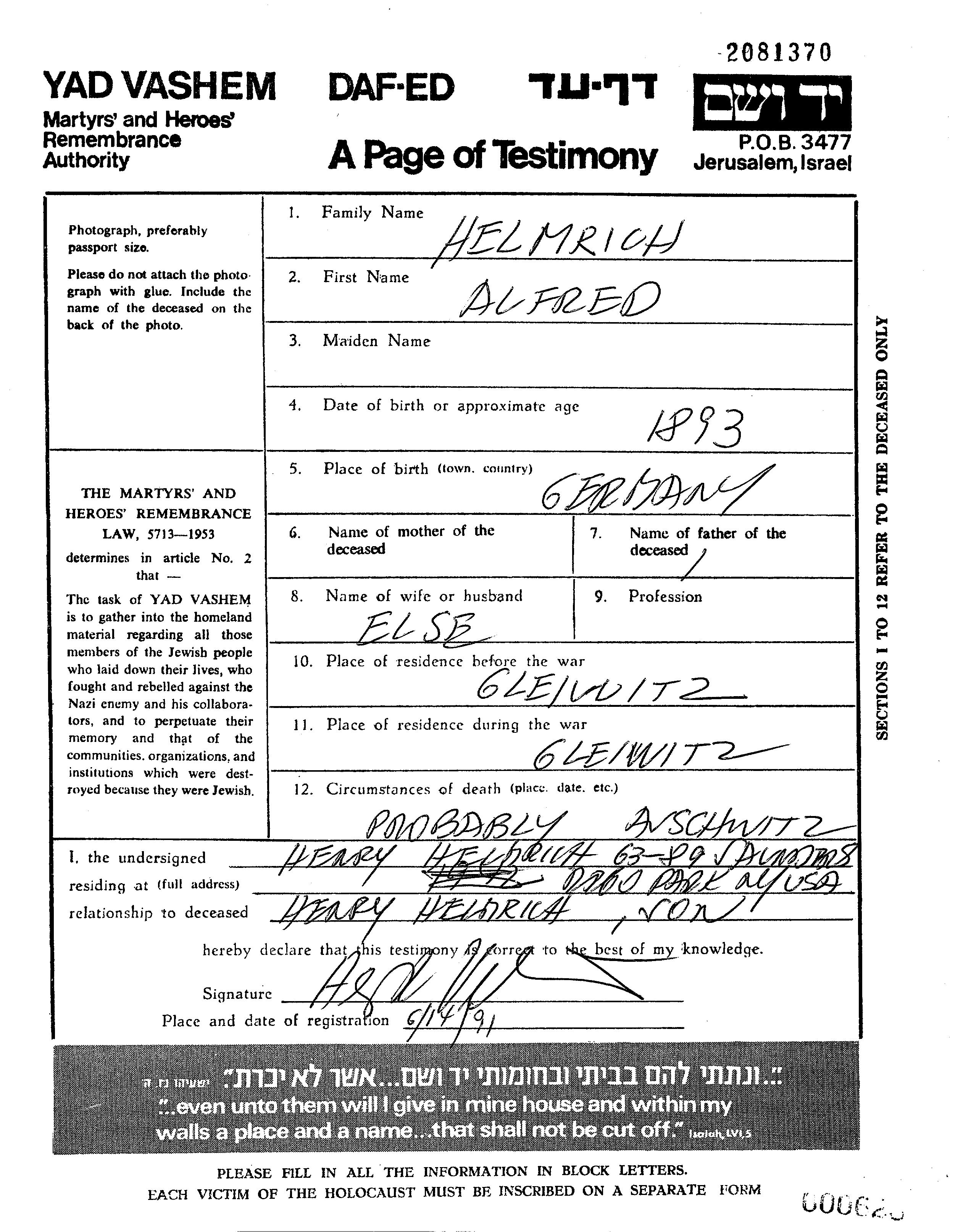 Alfred Helmrich wurde im Jahr 1893 in Deutsches Reich geboren. Er war mit Elsa Verheiratet. Vor dem Zweiten Weltkrieg lebte er in Gleiwitz, Deutsches Reich. Während des Krieges war er in Gleiwitz, Deutsches Reich.