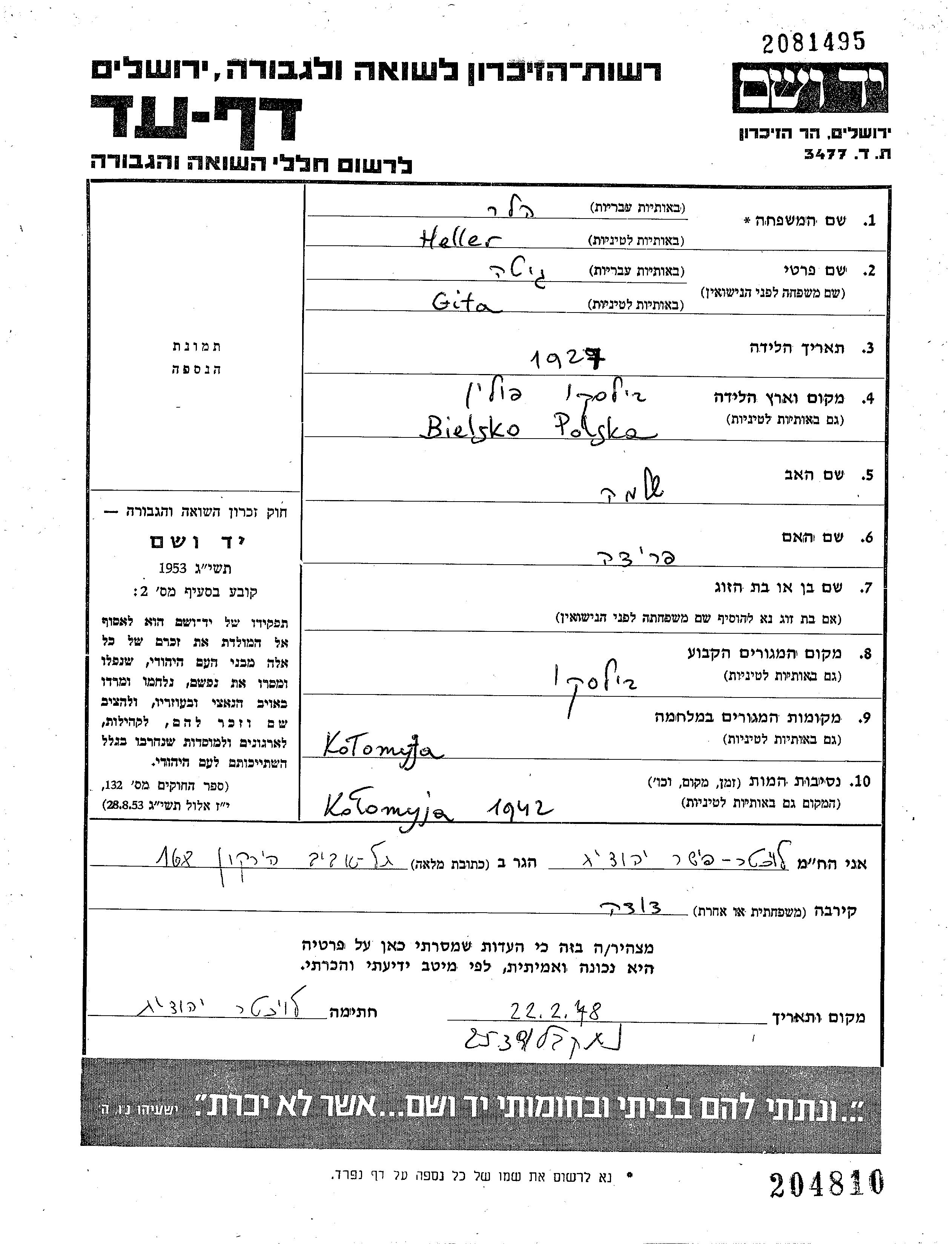 Gita Heller wurde im Jahr 1927 in Bielsko, Polen geboren. Sie war die Tochter von Shlomo und Frida. Vor dem Zweiten Weltkrieg lebte sie in Bielsko, Polen. Während des Krieges war sie in Kolomyja, Polen.