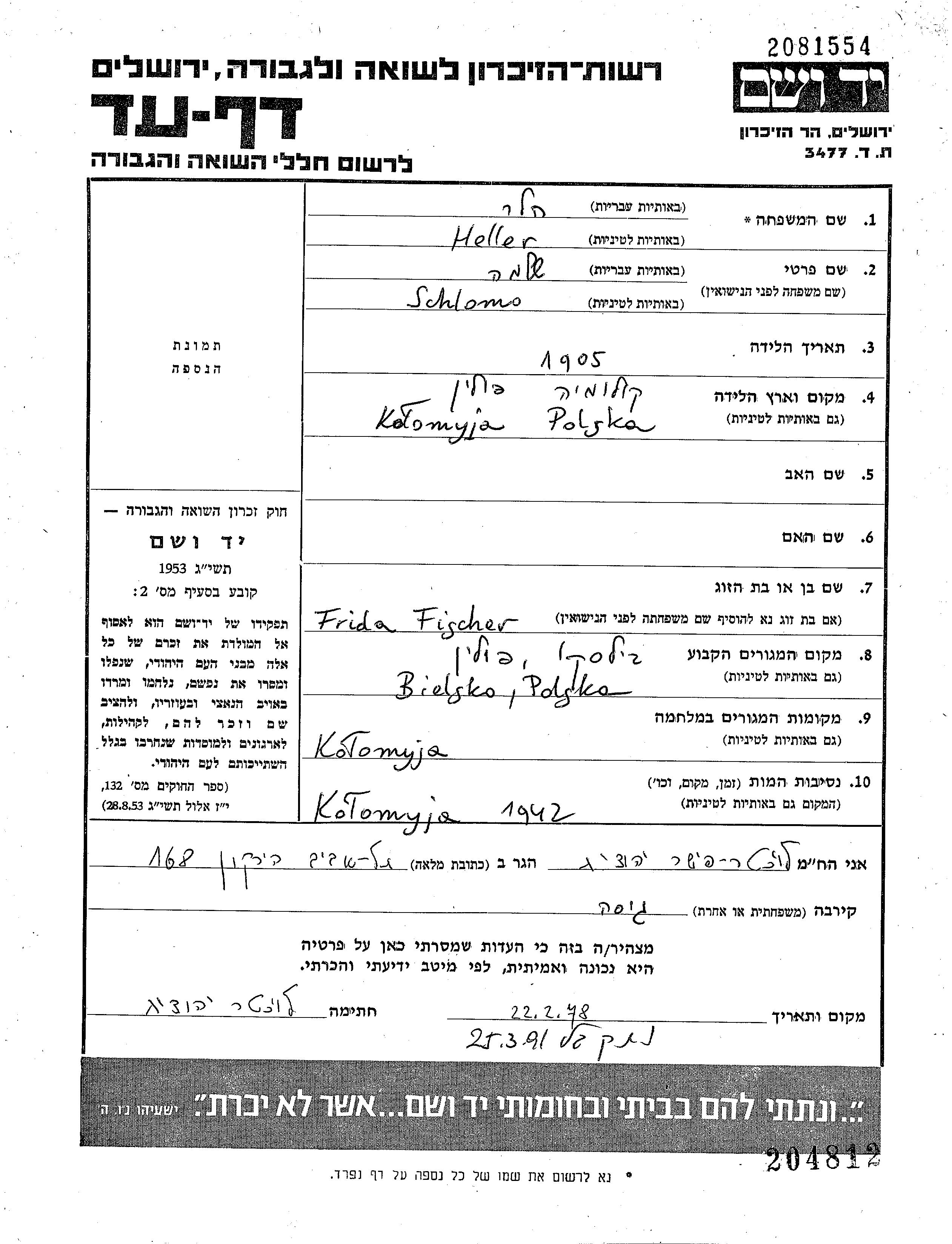 Schlomo Heller wurde im Jahr 1905 in Kolomyja, Polen geboren. Er war mit Frida Verheiratet. Vor dem Zweiten Weltkrieg lebte er in Bielsko, Polen. Während des Krieges war er in Kolomyja, Polen.