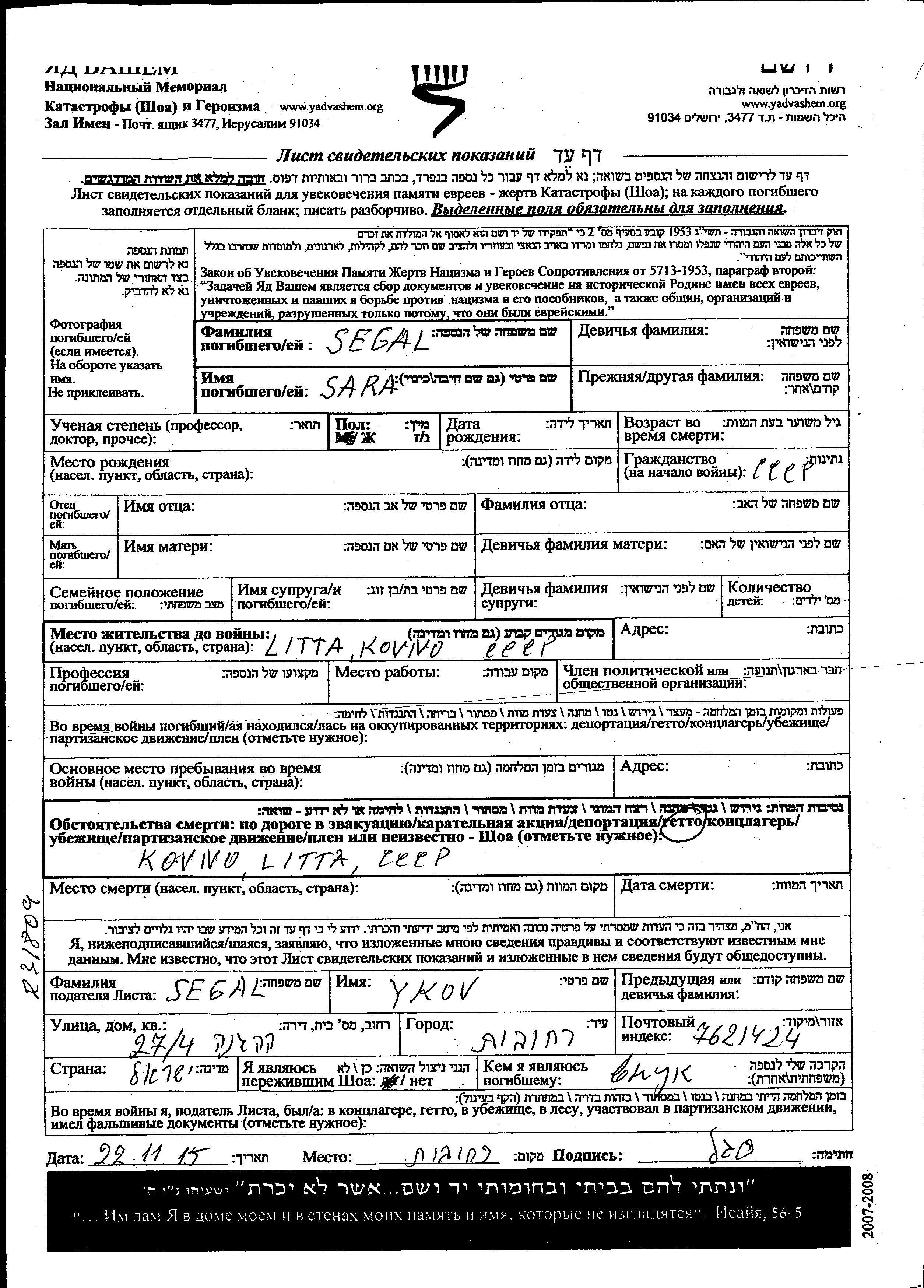 Sara Segal. Vor dem Zweiten Weltkrieg lebte sie in Kowno, Litauen. Während des Krieges war sie in Kowno, Litauen.