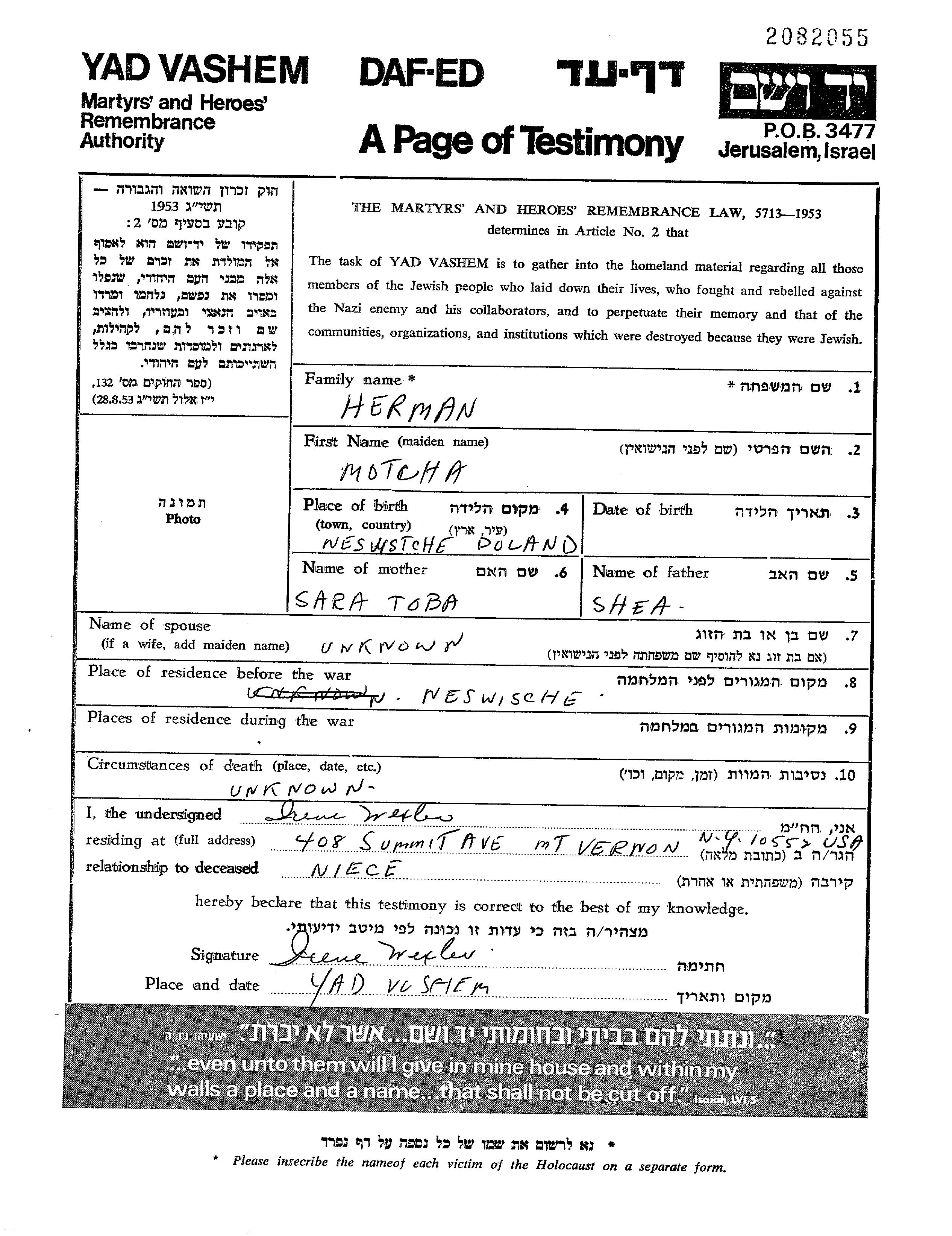 Motcha Mota Herman wurde in Nieśwież, Polen geboren. Er war der Sohn von Shea Shaia und Toba Sara Tova. Vor dem Zweiten Weltkrieg lebte er in Nieśwież, Polen.