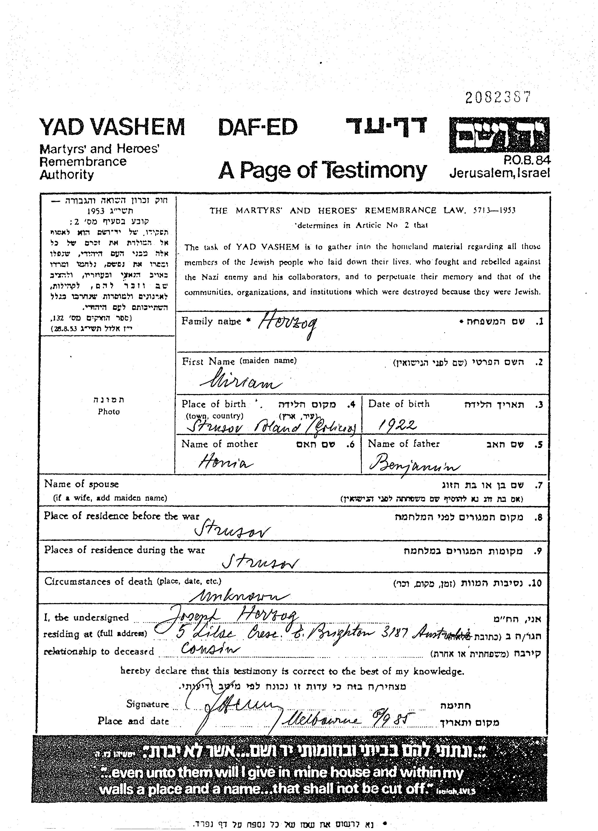Miriam Herzog wurde im Jahr 1922 in Strusow, Polen geboren. Sie war die Tochter von Benjamin und Henia. Vor dem Zweiten Weltkrieg lebte sie in Strusow, Polen. Während des Krieges war sie in Strusow, Polen.