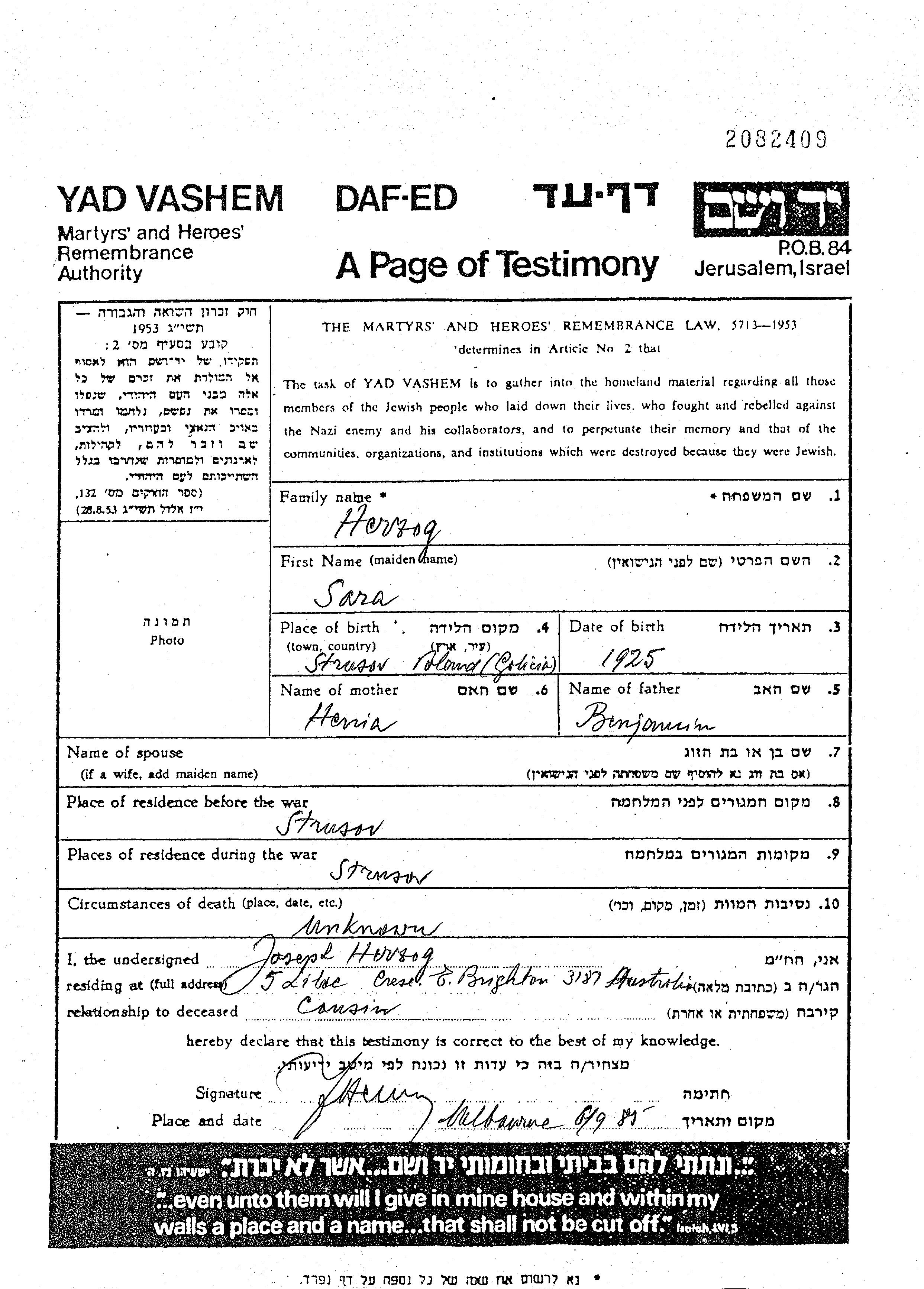 Sara Herzog wurde im Jahr 1925 in Strusow, Polen geboren. Sie war die Tochter von Benjamin und Henia. Sie war Kind. Vor dem Zweiten Weltkrieg lebte sie in Strusow, Polen. Während des Krieges war sie in Strusow, Polen.