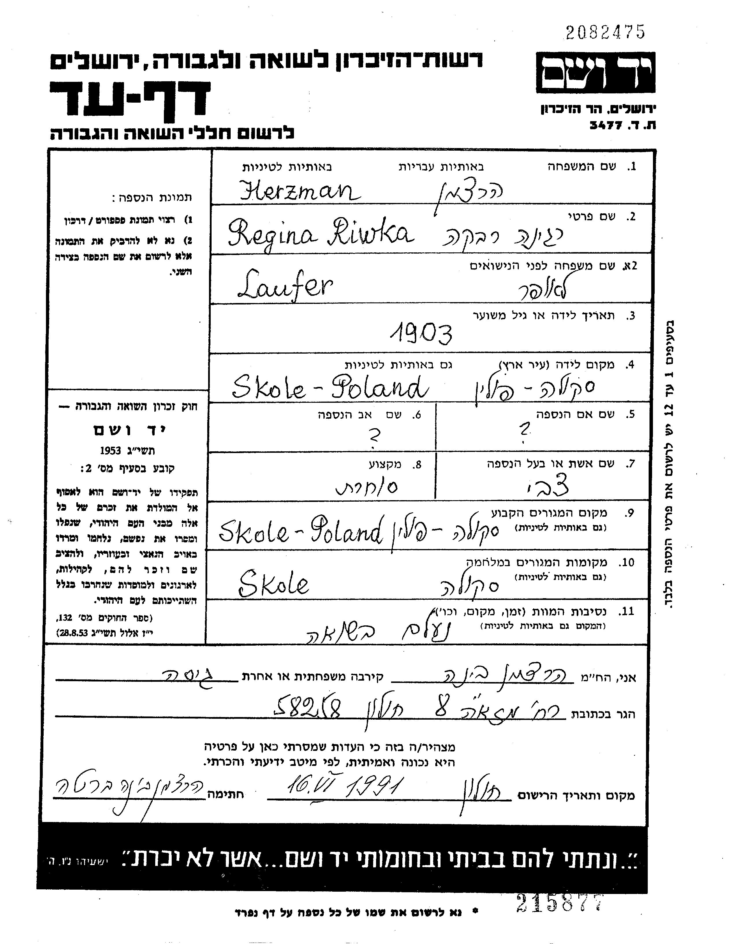 Riwka Regina Herzman, geb. Laufer wurde im Jahr 1903 in Skole, Polen geboren. Sie war Kaufmann/-frau und mit Tzvi Verheiratet. Vor dem Zweiten Weltkrieg lebte sie in Skole, Polen. Während des Krieges war sie in Skole, Polen.