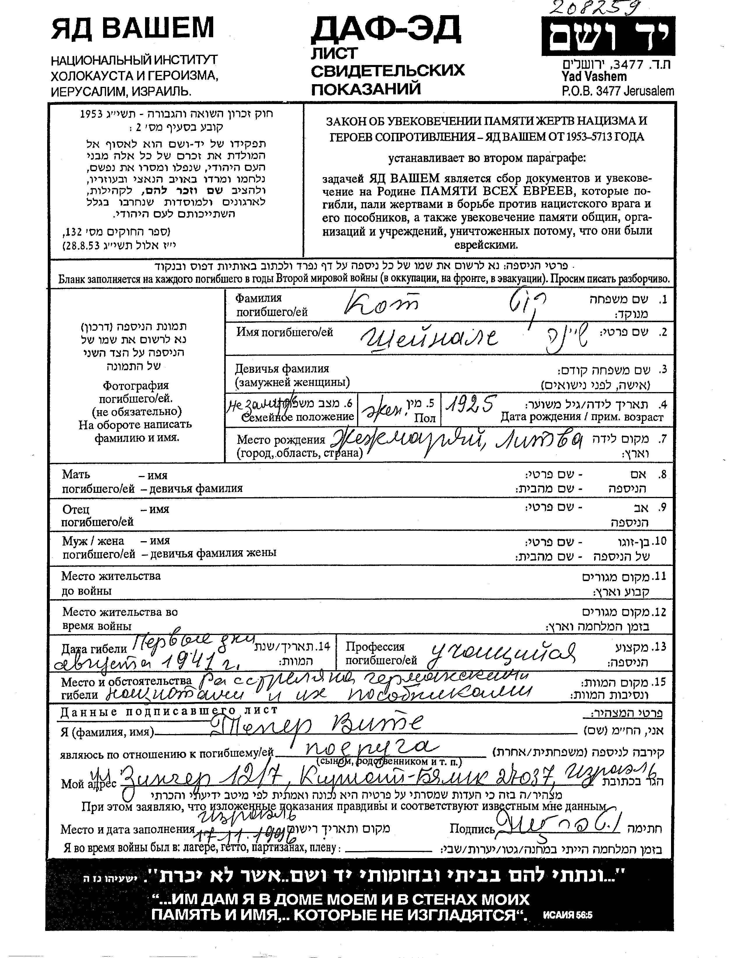 Sheina Kot wurde im Jahr 1925 in Ziezmariai, Litauen geboren. Sie war Schüler/-in und Kind. Vor dem Zweiten Weltkrieg lebte sie in Litauen. Während des Krieges war sie in Litauen.
