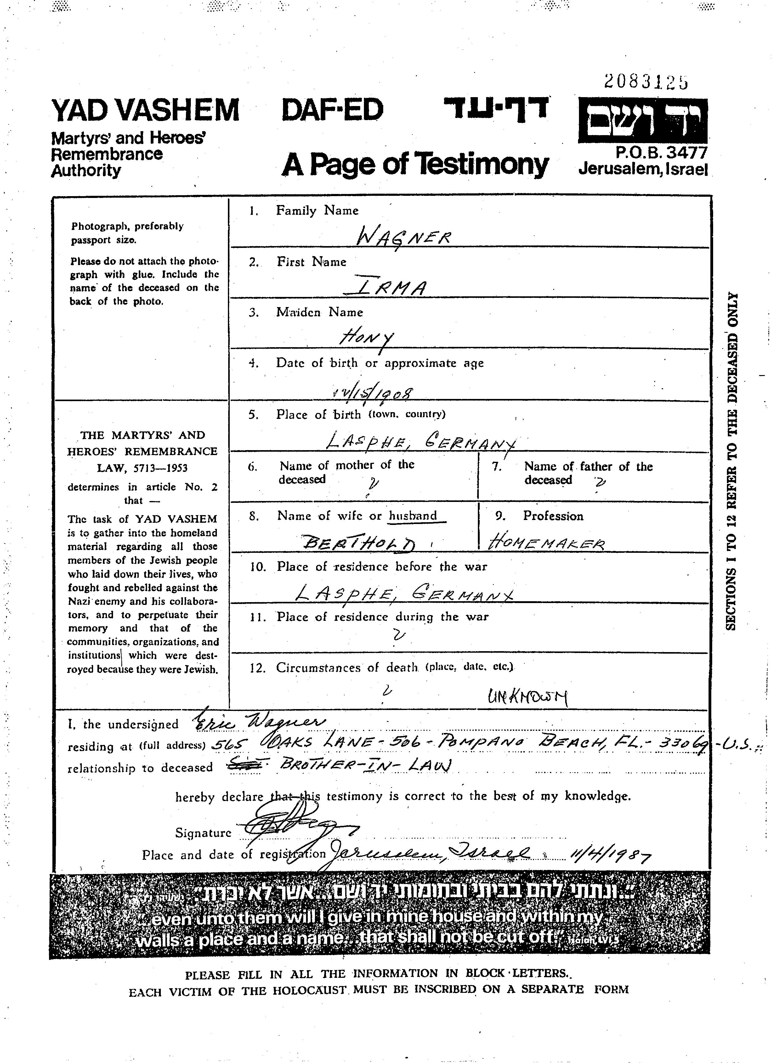 Irma Wagner, geb. Hony wurde im Jahr 1908 in Laasphe, Deutsches Reich geboren. Sie war Hausfrau und mit Berthold Verheiratet. Vor dem Zweiten Weltkrieg lebte sie in Laasphe, Deutsches Reich.