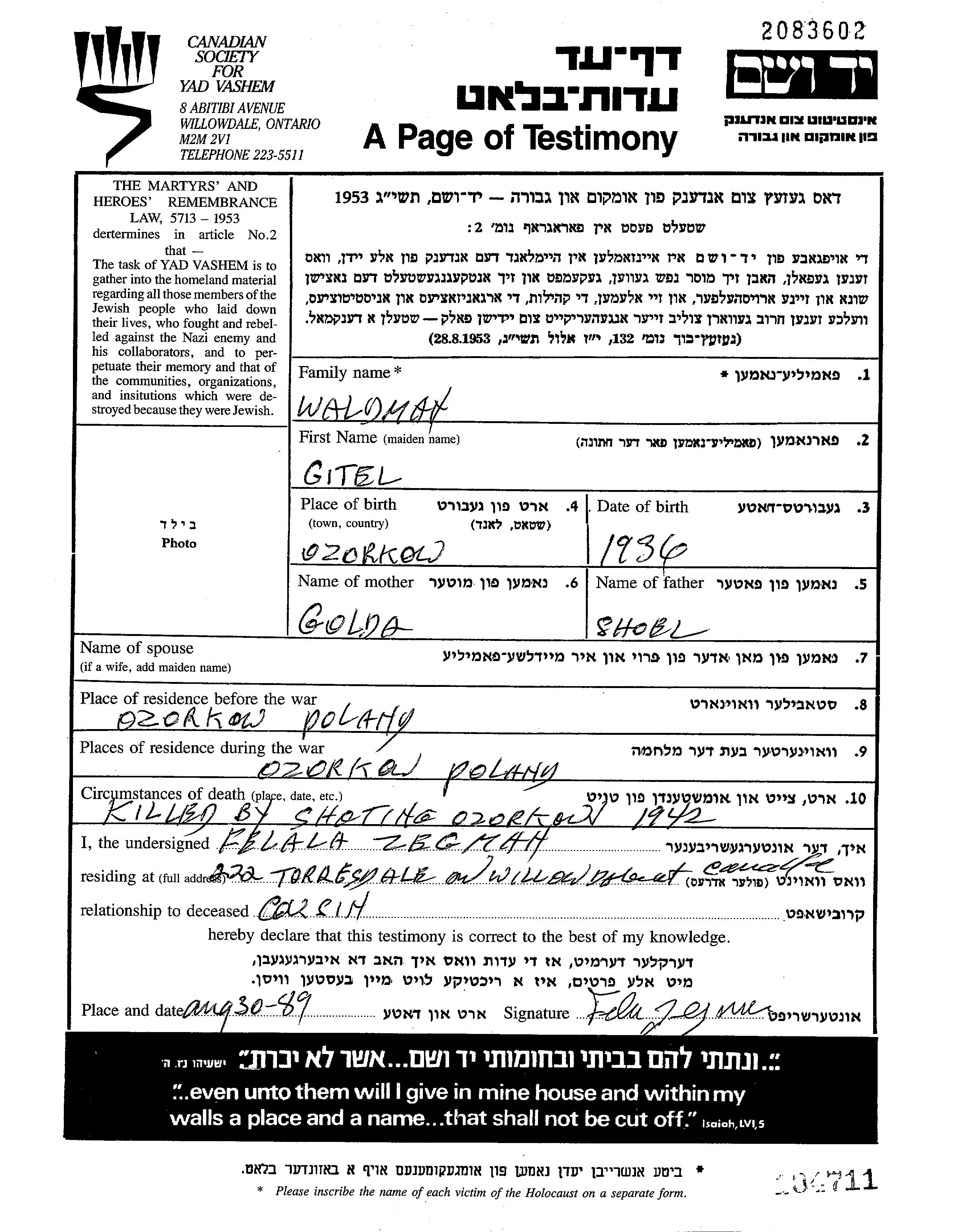 Gitel Waldman wurde in Ozorkow, Polen geboren. Sie war die Tochter von Shoel und Golda, geb. Rashecky. Sie war Kind. Vor dem Zweiten Weltkrieg lebte sie in Ozorkow, Polen. Während des Krieges war sie in Ozorkow, Polen.
