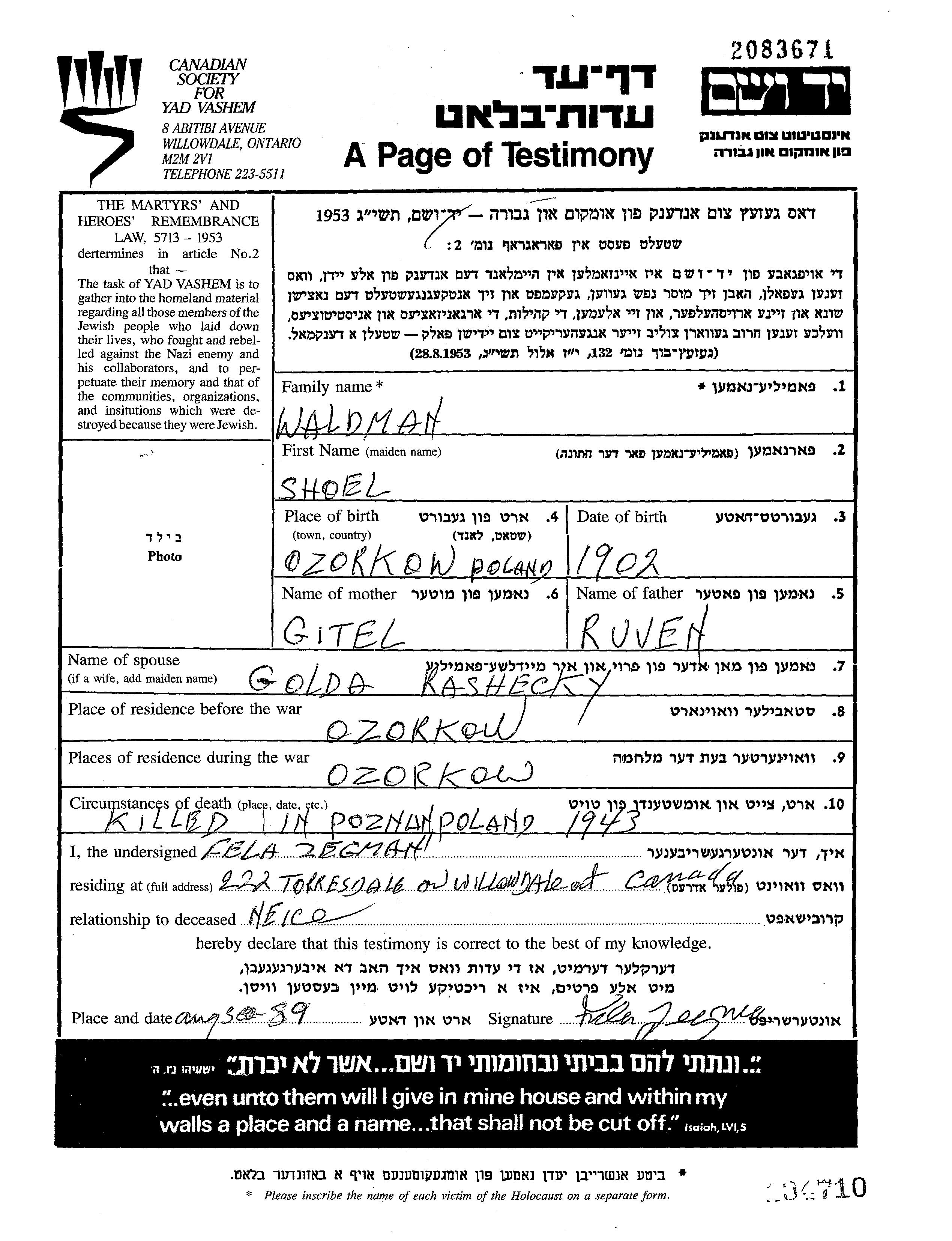 Shoel Waldman wurde in Ozorkow, Polen geboren. Er war der Sohn von Ruven und Gitel. Er war mit Golda, geb. Rashecky Verheiratet. Vor dem Zweiten Weltkrieg lebte er in Ozorkow, Polen. Während des Krieges war er in Ozorkow, Polen.