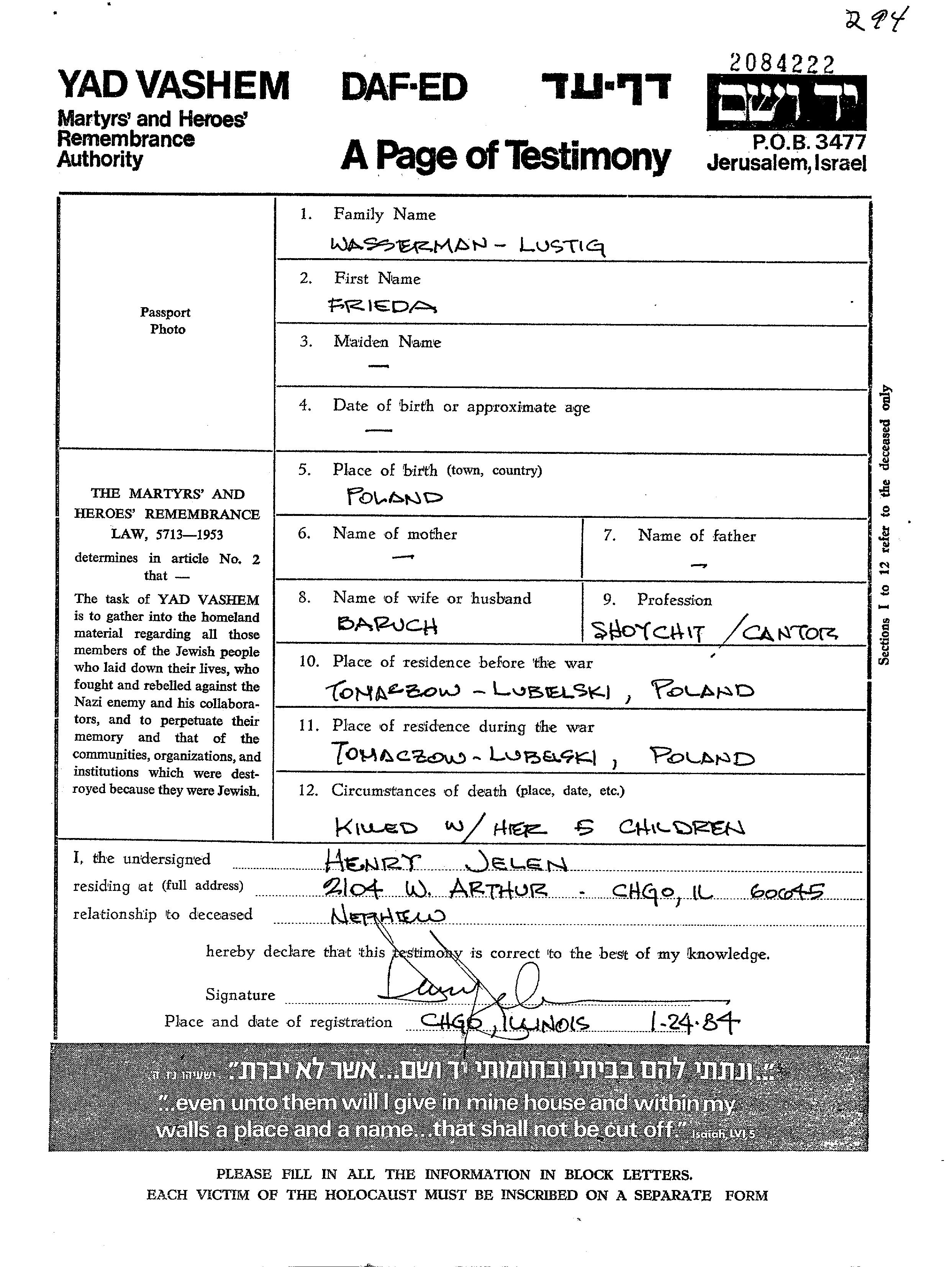 Frieda Wasserman Lustig wurde in Polen geboren. Sie war Hausfrau und mit Baruch Verheiratet. Vor dem Zweiten Weltkrieg lebte sie in Tomaszow, Polen. Während des Krieges war sie in Tomaszow, Polen.