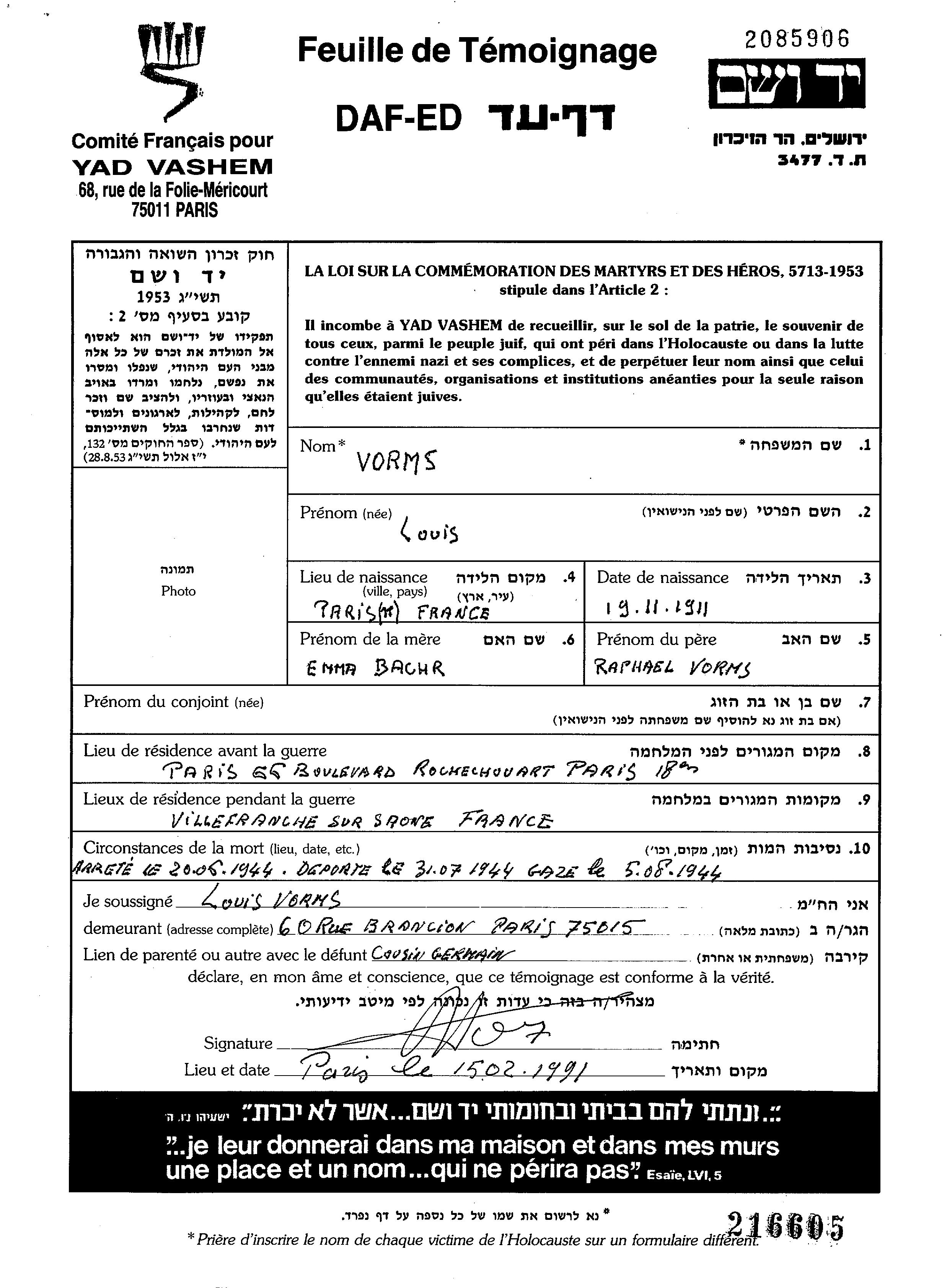 Louis Vurms wurde im Jahr 1911 in Paris, Frankreich geboren. Er war der Sohn von Raphael und Emma, geb. Bachr. Vor dem Zweiten Weltkrieg lebte er in Paris, Frankreich. Während des Krieges war er in Villefranche sur Saone, Frankreich. und wurde mit Transport 77 von Drancy,Lager,Frankreich nach Auschwitz Birkenau,Vernichtungslager,Polen am 31/07/1944.