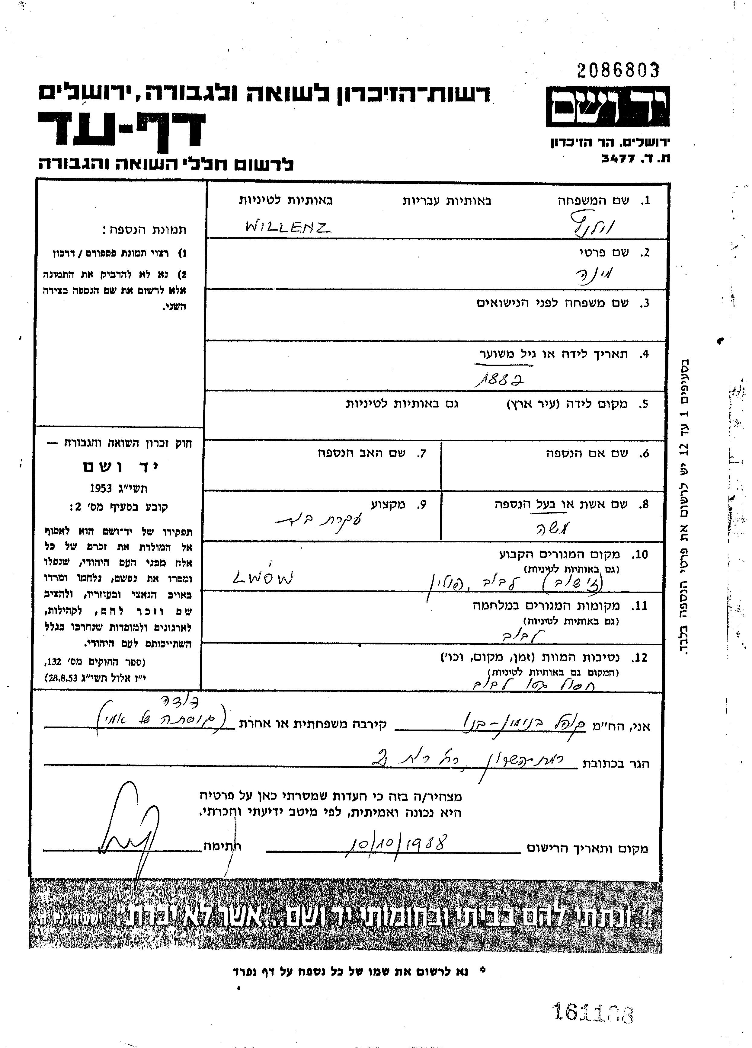 Mina Willenz wurde im Jahr 1882 geboren. Sie war Hausfrau und mit Moshe Verheiratet. Vor dem Zweiten Weltkrieg lebte sie in Lwow, Polen. Während des Krieges war sie in Lwow, Polen.