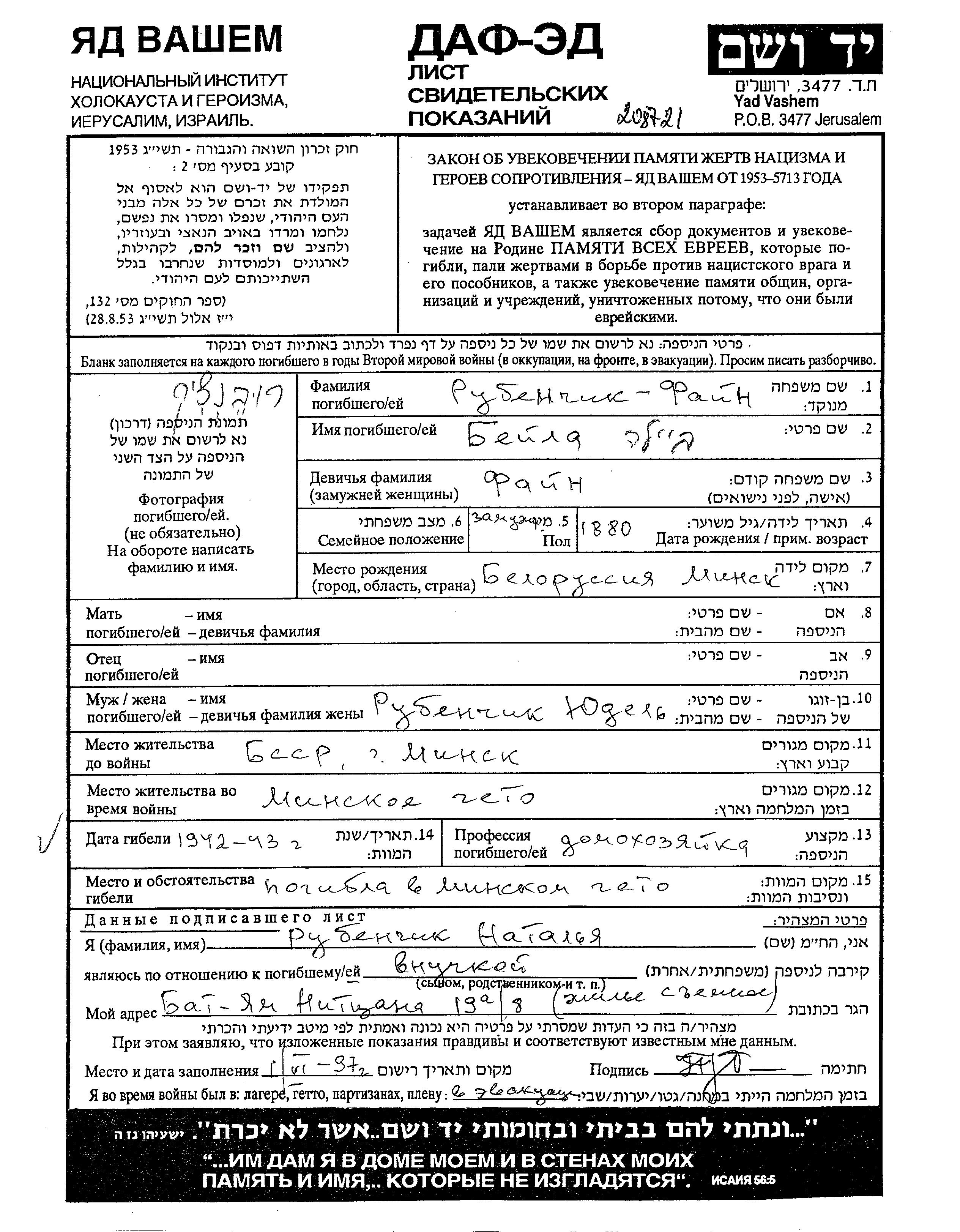 Beila Rubenchik, geb. Fain wurde im Jahr 1880 in Minsk, Weißrussland (UdSSR) geboren. Sie war Hausfrau und mit Yudel Verheiratet. Vor dem Zweiten Weltkrieg lebte sie in Minsk, Weißrussland (UdSSR). Während des Krieges war sie in Minsk, Weißrussland (UdSSR).