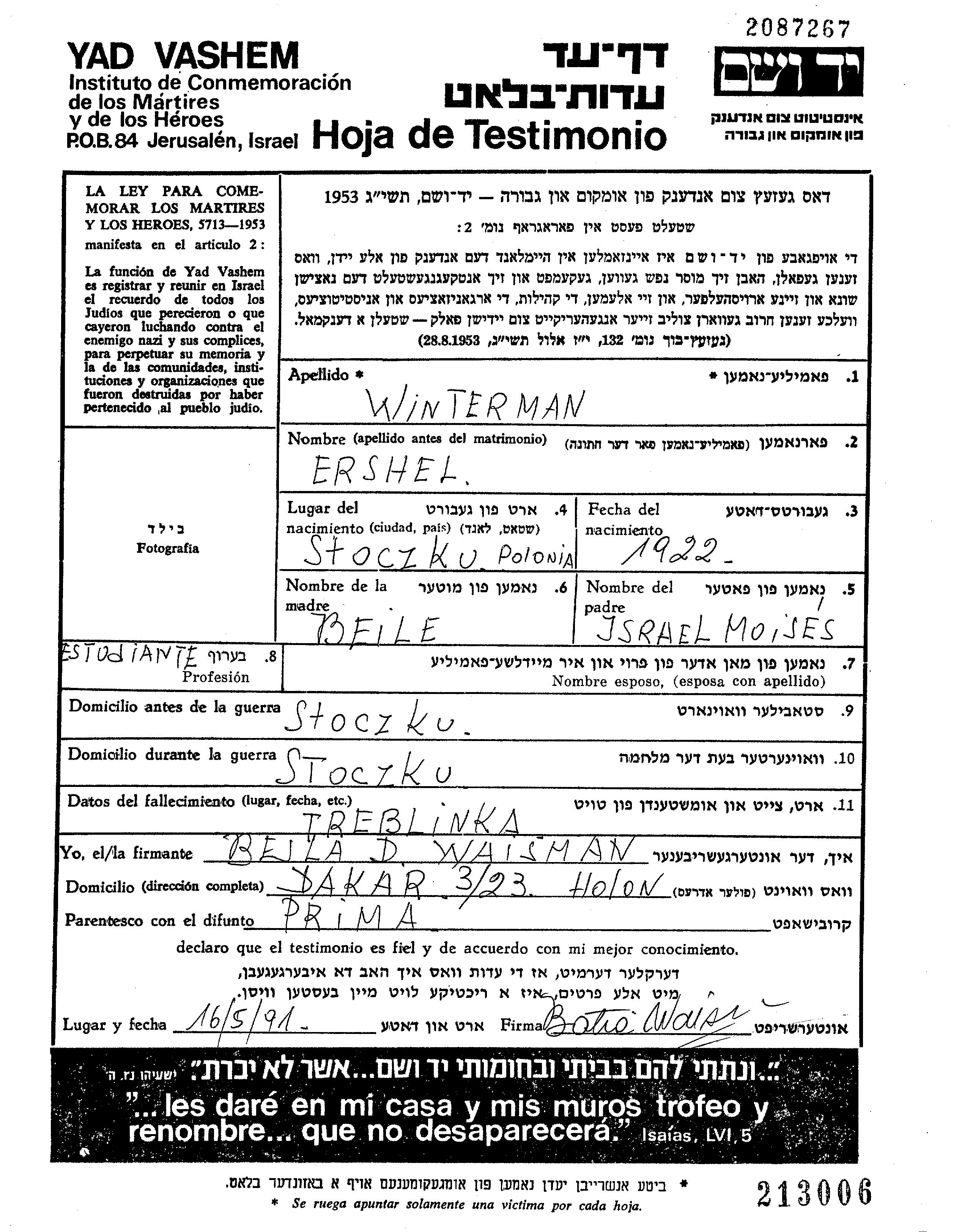 Ershel Winterman wurde im Jahr 1922 in Stoczek, Polen geboren. Er war der Sohn von Israel Moises und Beile, geb. Kijak. Er war Student. Vor dem Zweiten Weltkrieg lebte er in Stoczek, Polen. Während des Krieges war er in Stoczek, Polen.