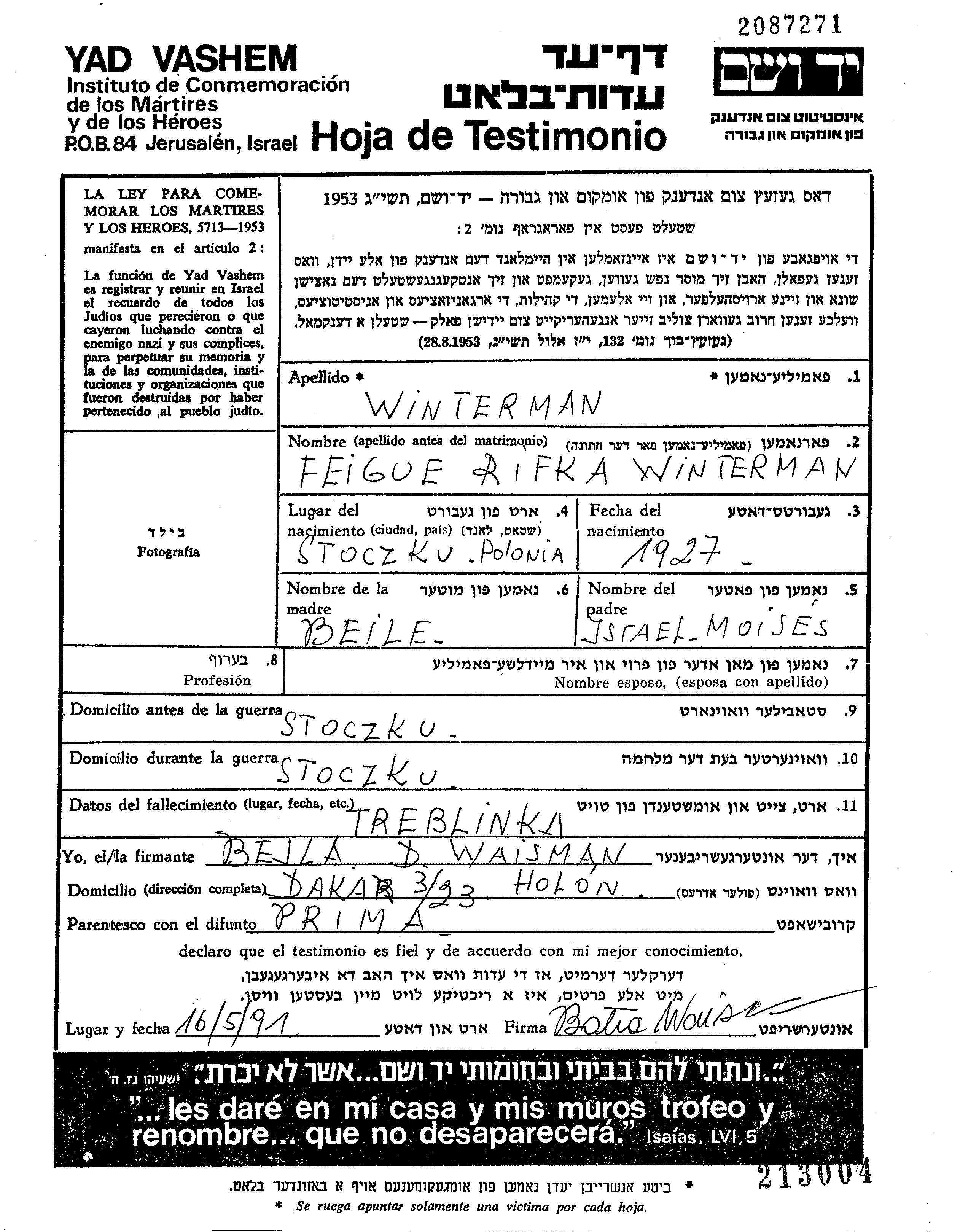 Feigue Rivka Winterman wurde im Jahr 1927 in Stoczek, Polen geboren. Sie war die Tochter von Israel Moises und Beile, geb. Kijak. Sie war Kind. Vor dem Zweiten Weltkrieg lebte sie in Stoczek, Polen. Während des Krieges war sie in Stoczek, Polen.