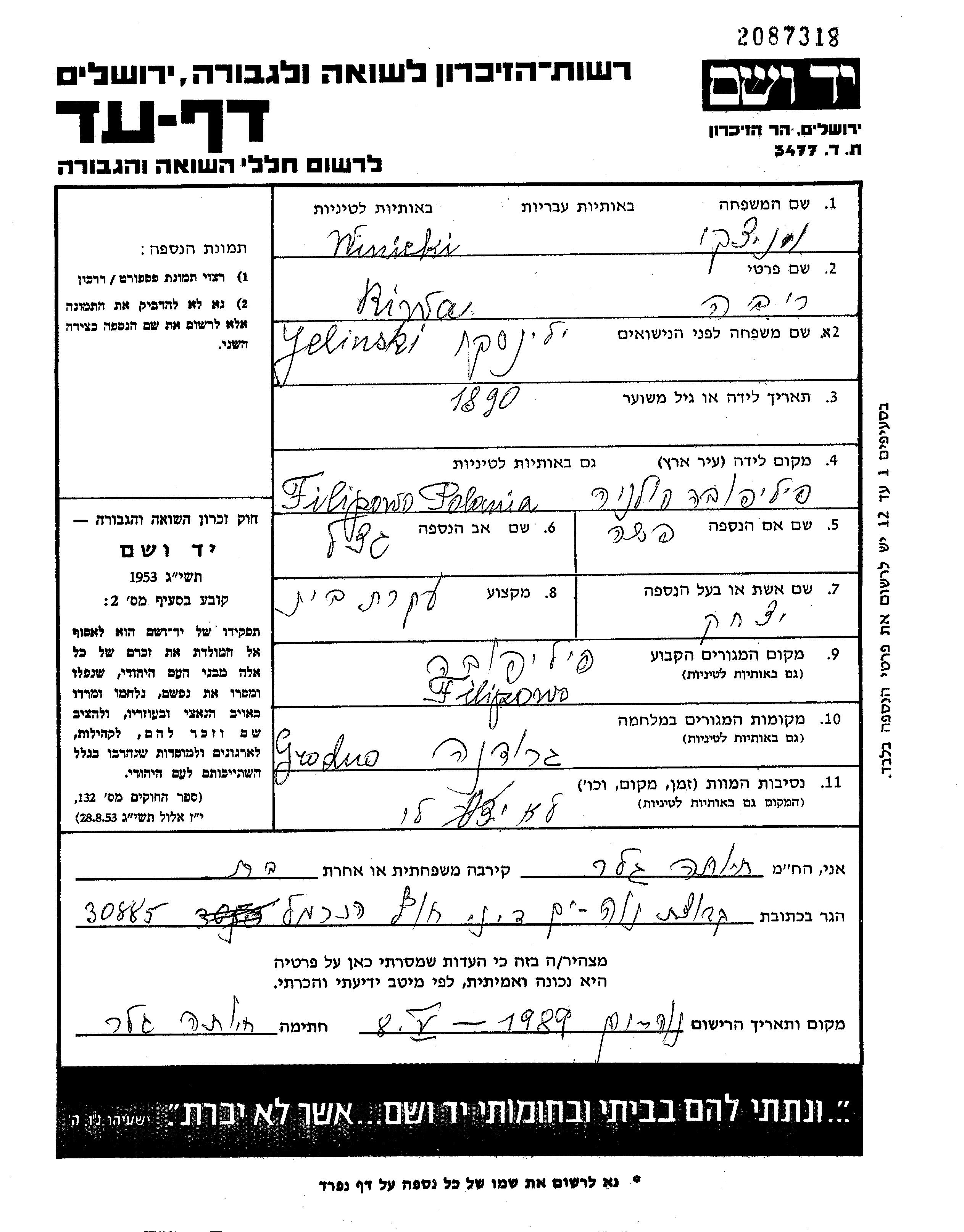Riwa Winicki, geb. Yelinski wurde im Jahr 1890 in Filipow, Polen geboren. Sie war die Tochter von Getzel und Pesha. Sie war Hausfrau und mit Ytzkhak Verheiratet. Vor dem Zweiten Weltkrieg lebte sie in Filipow, Polen. Während des Krieges war sie in Grodno, Polen.