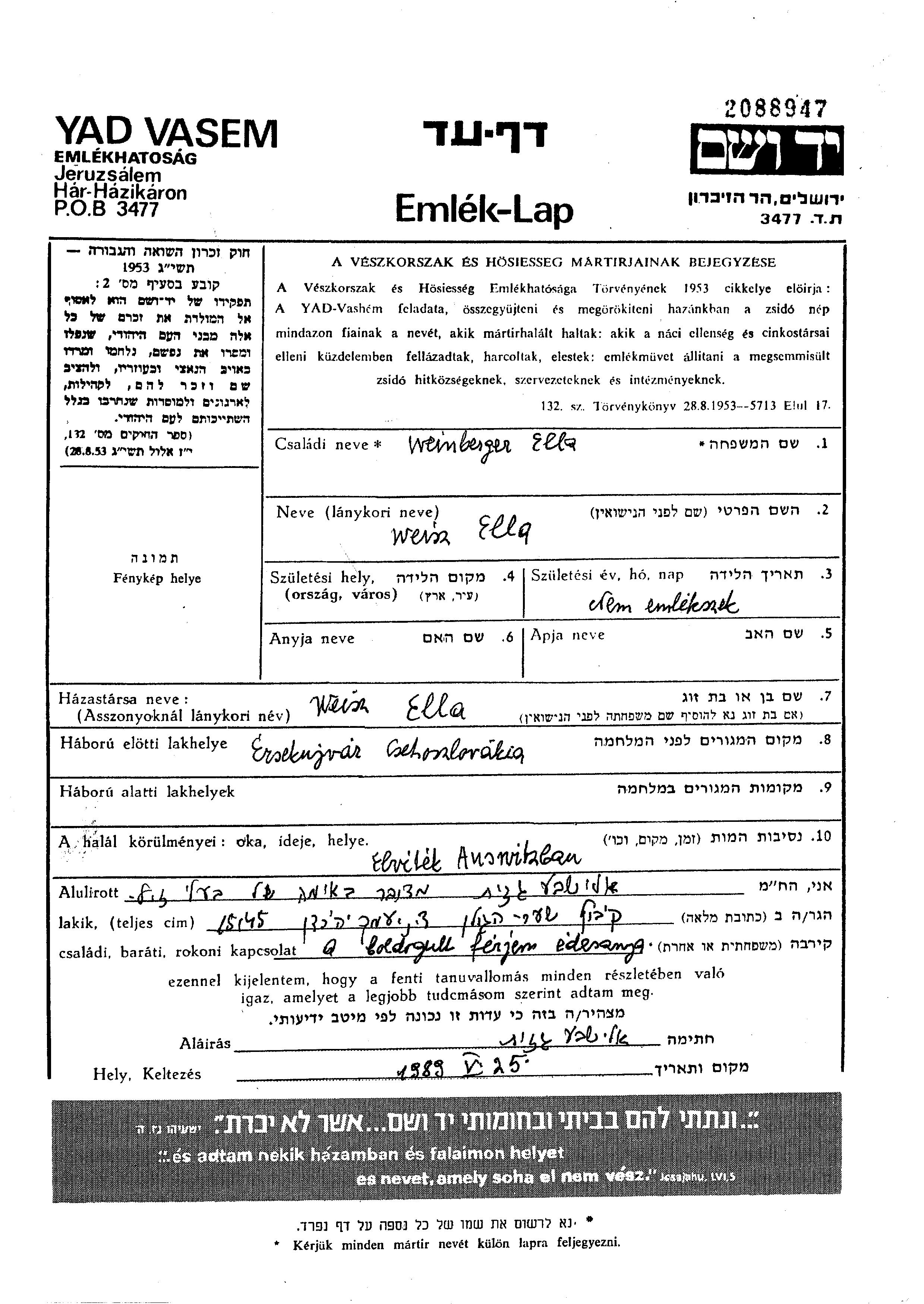 Weinberger Ella Ersekujvar, Tschechoslowakei Gedenkblatt