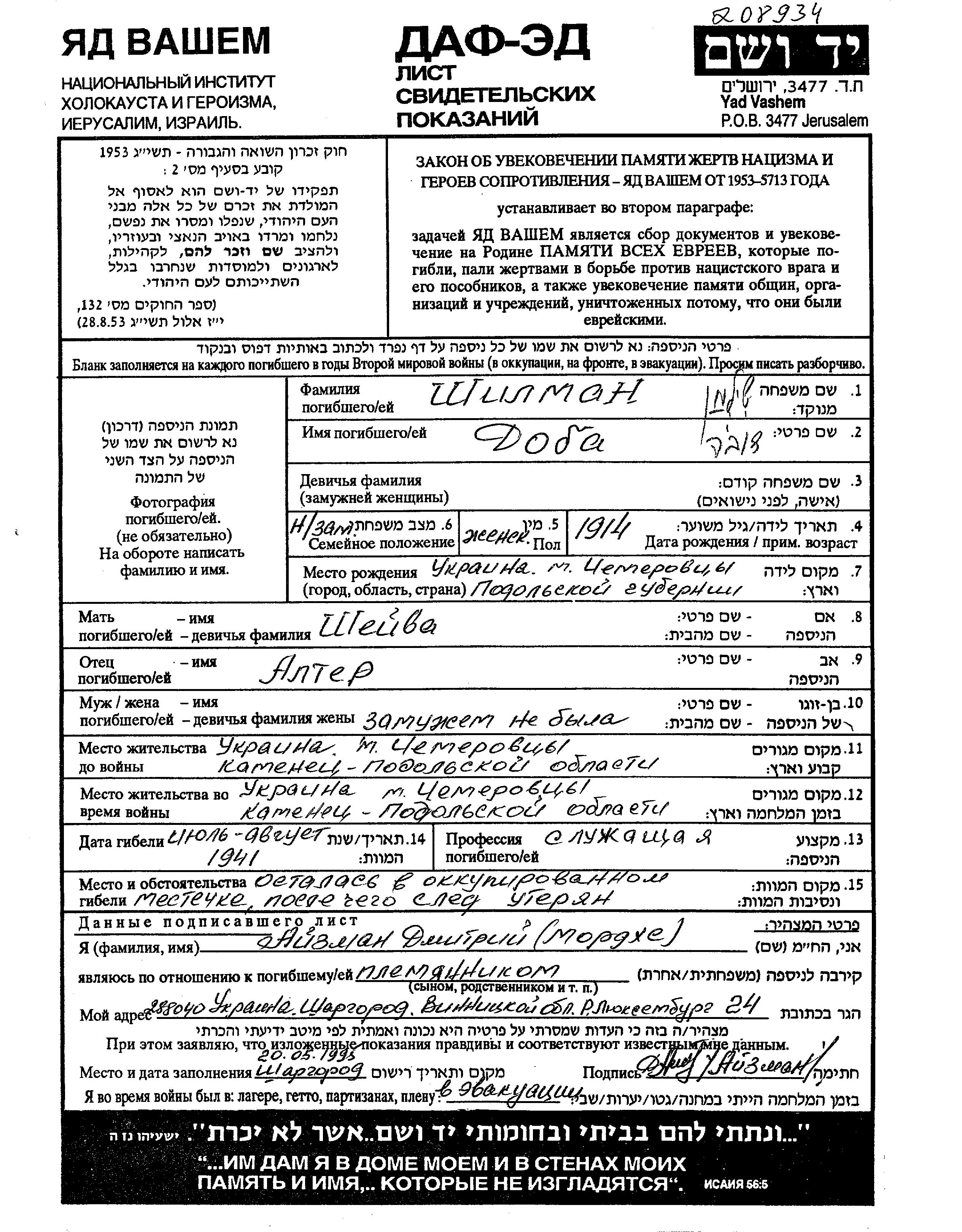 Doba Shilman wurde im Jahr 1914 in Chemerovtsy, Ukraine (UdSSR) geboren. Sie war die Tochter von Alter und Sheiva. Sie war Angestellte/-r und Ledig. Vor dem Zweiten Weltkrieg lebte sie in Chemerovtsy, Ukraine (UdSSR). Während des Krieges war sie in Chemerovtsy, Ukraine (UdSSR).