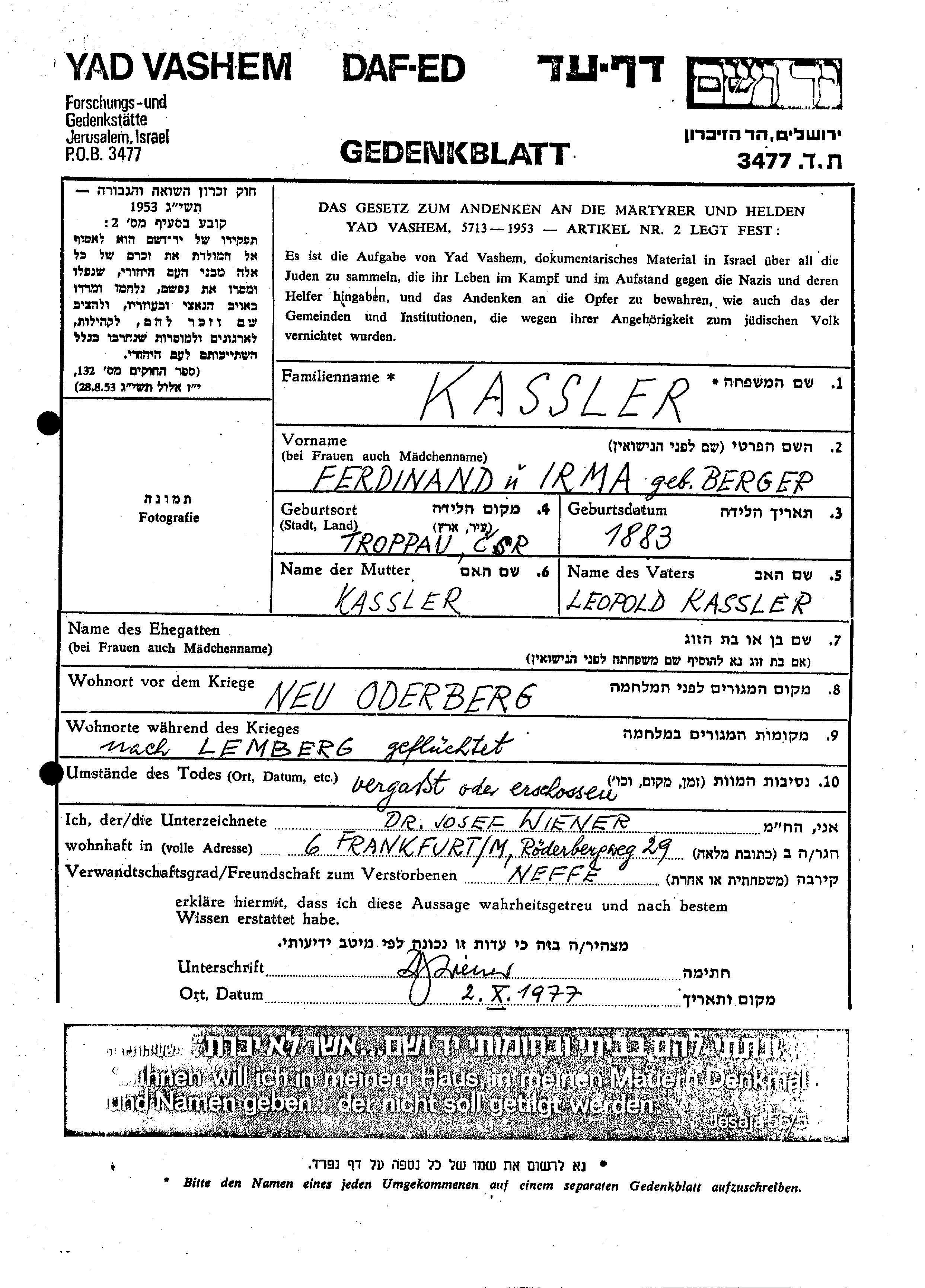 Suche nach einem Todesjahr im Zeitraum der Holocaust: 1933 bis 1945. Bitte wählen Sie 'Exakt' im Auswahlmenü, um nur nach einem einzelnen Jahr zu suchen, alternativ können Sie die flexibleren Optionen '+/- 2 Jahre' oder '+/- 5 Jahre' wählen.