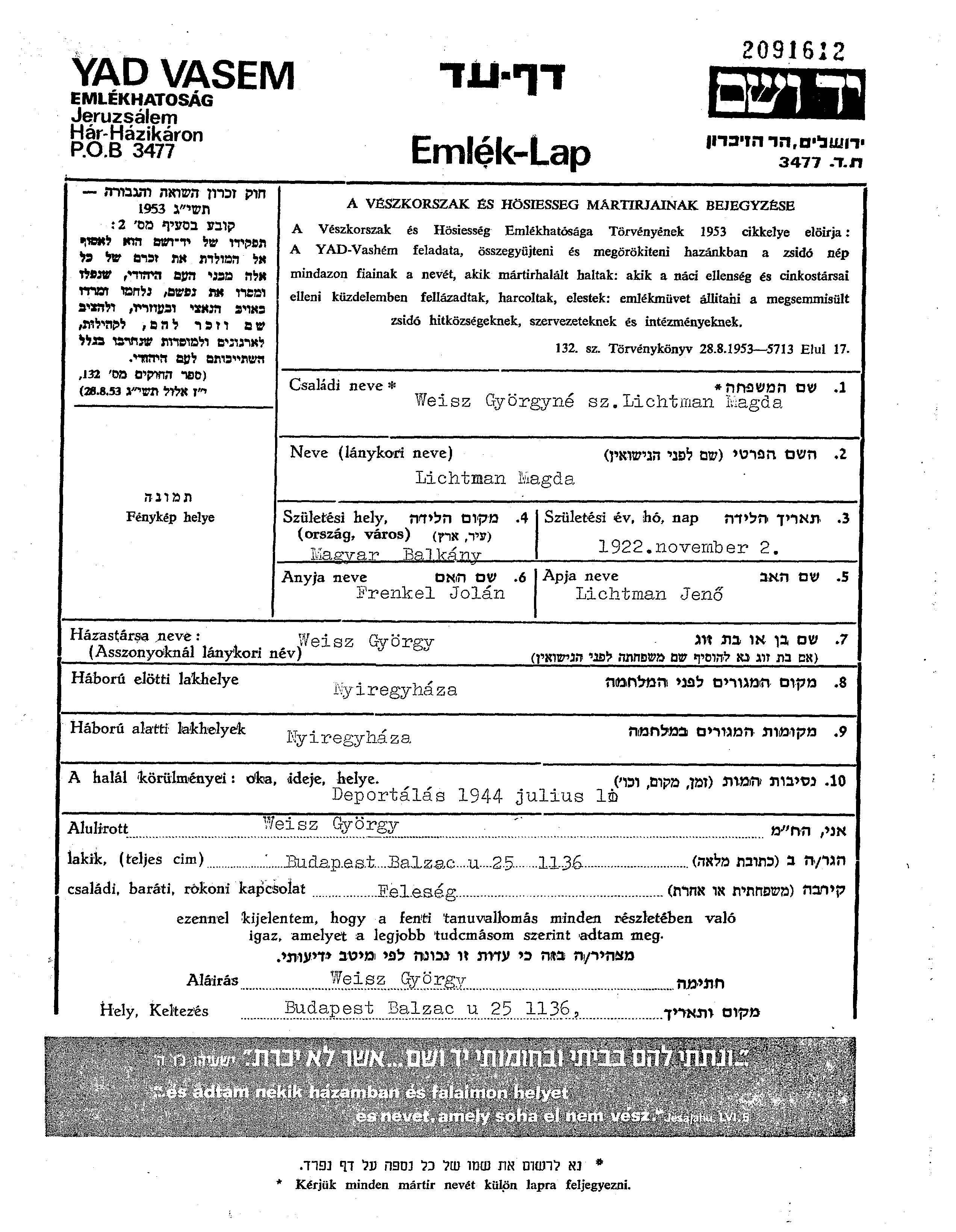 Magda Weisz, geb. Lichtman wurde im Jahr 1922 in Balkany, Ungarn geboren. Sie war die Tochter von Jeno und Jolan, geb. Frenkel. Sie war mit Gyorgy Verheiratet. Vor dem Zweiten Weltkrieg lebte sie in Nyiregyhaza, Ungarn. Während des Krieges war sie in Nyiregyhaza, Ungarn.
