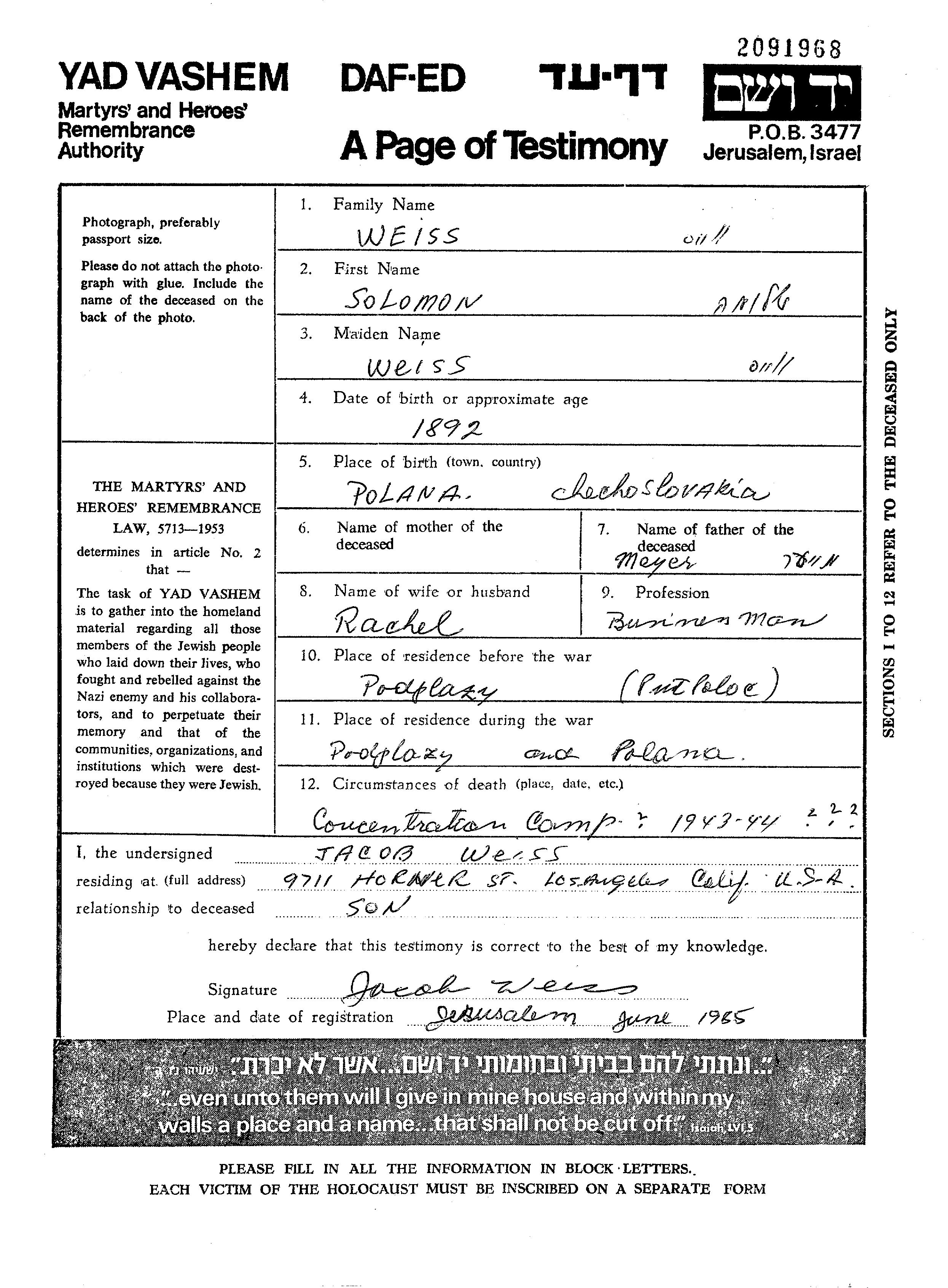 Solomon Weiss wurde im Jahr 1892 in Polana, Tschechoslowakei geboren. Er war der Sohn von Meyer. Er war Geschäftsmann und mit Rachel Verheiratet. Vor dem Zweiten Weltkrieg lebte er in Podplesa, Tschechoslowakei. Während des Krieges war er in Podplesa, Tschechoslowakei.