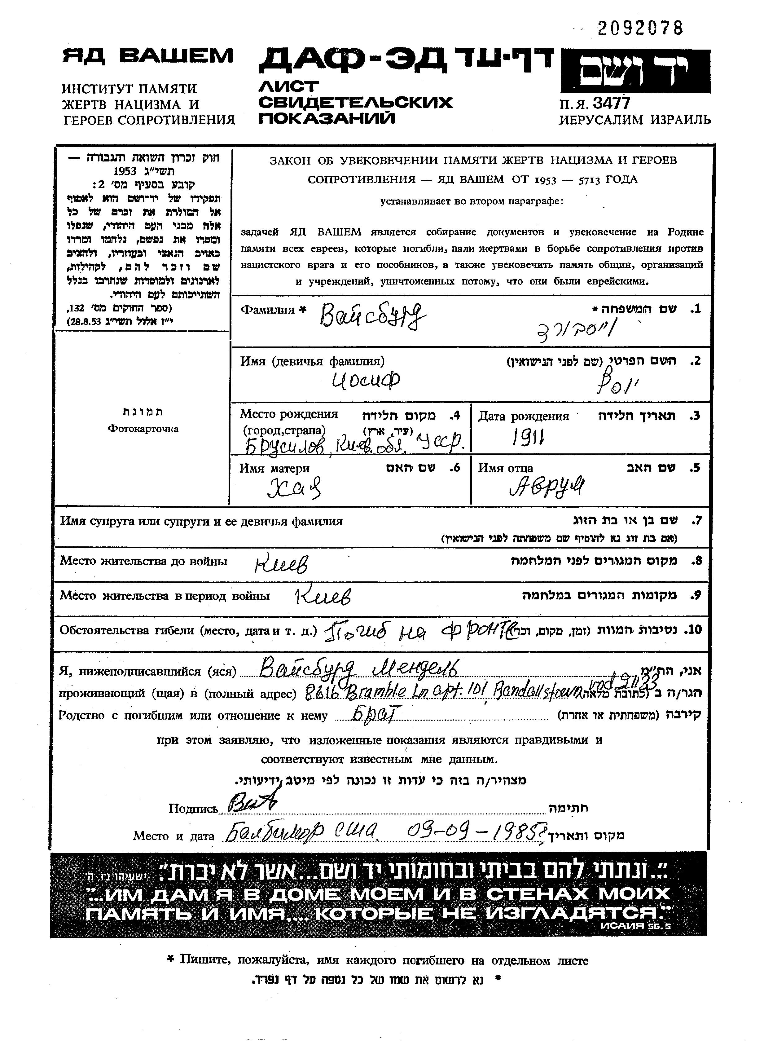 Iosif Vaisburd Veisbord wurde im Jahr 1911 in Brusilov, Ukraine (UdSSR) geboren. Er war der Sohn von Avrum und Khaia. Vor dem Zweiten Weltkrieg lebte er in Kiyev, Ukraine (UdSSR). Während des Krieges war er in die Sowjetischen Streitkräfte.
